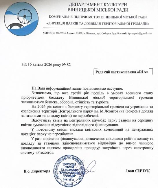 «Уже третій рік поспіль в умовах воєнного стану пріоритетами бюджету Вінницької міської територіальної громади залишаються безпека, оборона, стійкість та турбота. На 2026 рік кошти на утримання та озеленення парку не передбачені. Відсутність квітів на центральних клумбах зумовлена відсутністю відповідного фінансування. У поточному сезоні висадка квіткових композицій на центральних локаціях не планується», — повідомив Іван Сичук.