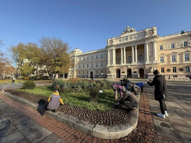 У центрі мешканці та гості міста зможуть побачити понад 30 сортів тюльпанів, нарцисів, мускарів, а також квітучі дерева — сакури, магнолії, глоди, райські яблуні, груші Шантеклер, горобини та інші.У парку імені Івана Франка вже облаштували сім клумб із тюльпанами, де висадили 6800 цибулин чотирьох сортів. На клумбі перед університетом висадили 3600 тюльпанів сорту Darwin Pink Impression.