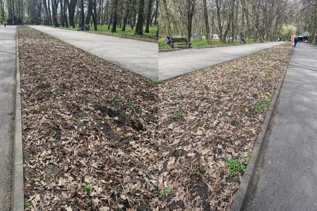 На календарі вже середина квітня, але головні клумби парку, здається, застрягли у листопаді. На центральних алеях замість сезонних насаджень — занедбані ділянки. Земля вкрита шаром сухого листя, що залишилося тут ще з минулого року. Візуально помітно, що квітники тривалий час не доглядалися: ґрунт не підсапаний, подекуди захаращений сміттям, а залишки сухостою не прибрані.