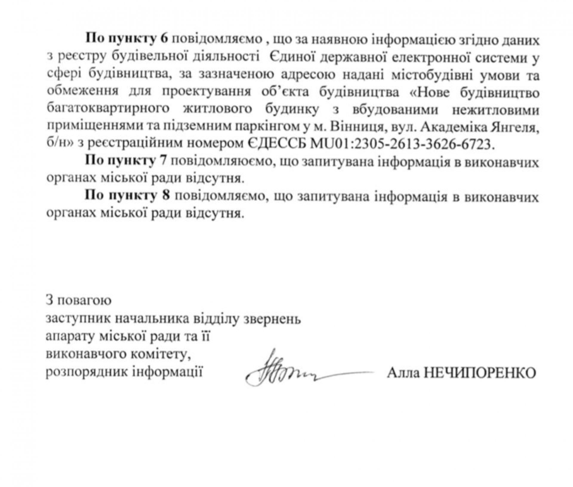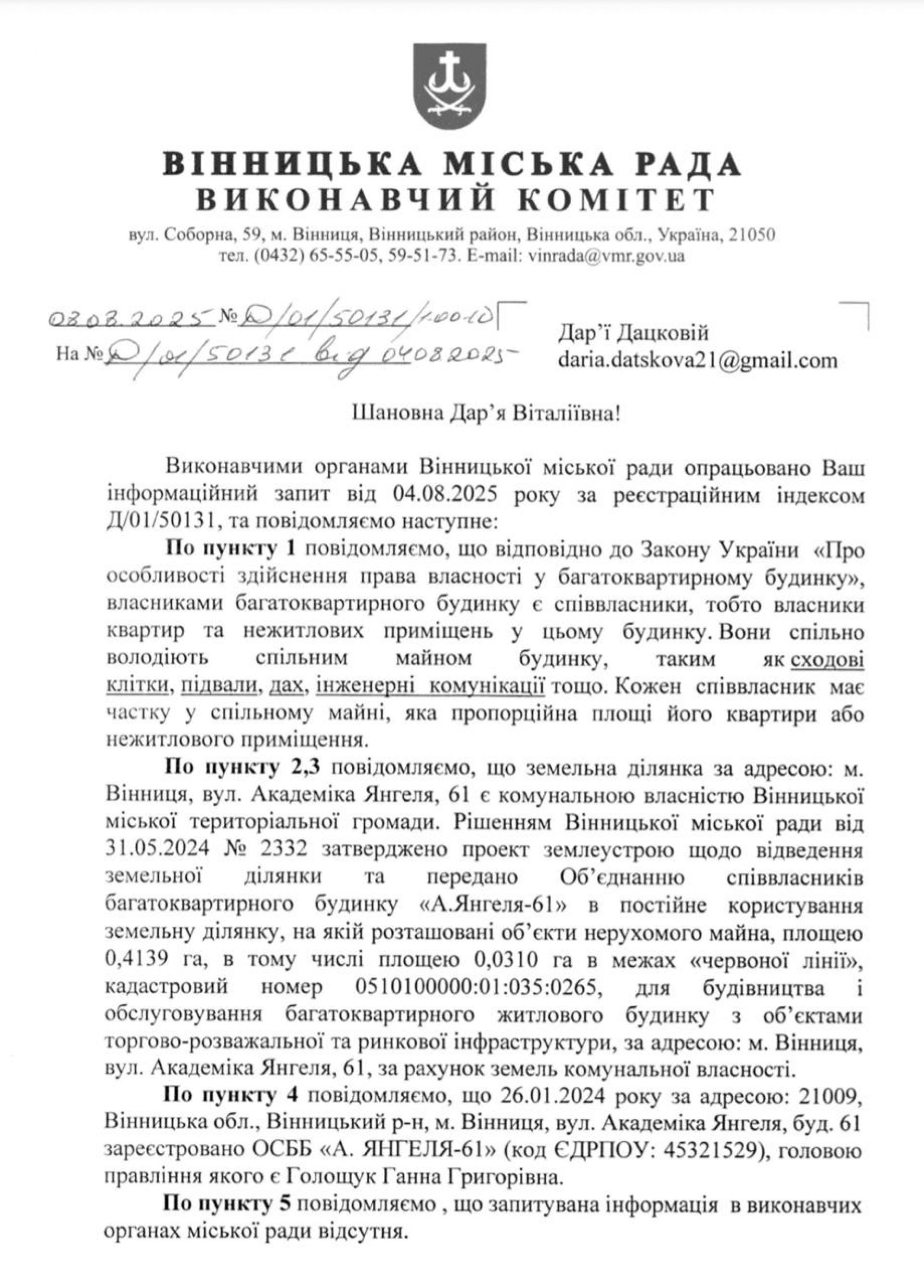 Паралельно ми звернулися із запитом до Вінницької міської ради. У відповіді повідомили, що дана земельна ділянка є комунальною власністю Вінницької міської територіальної громади.