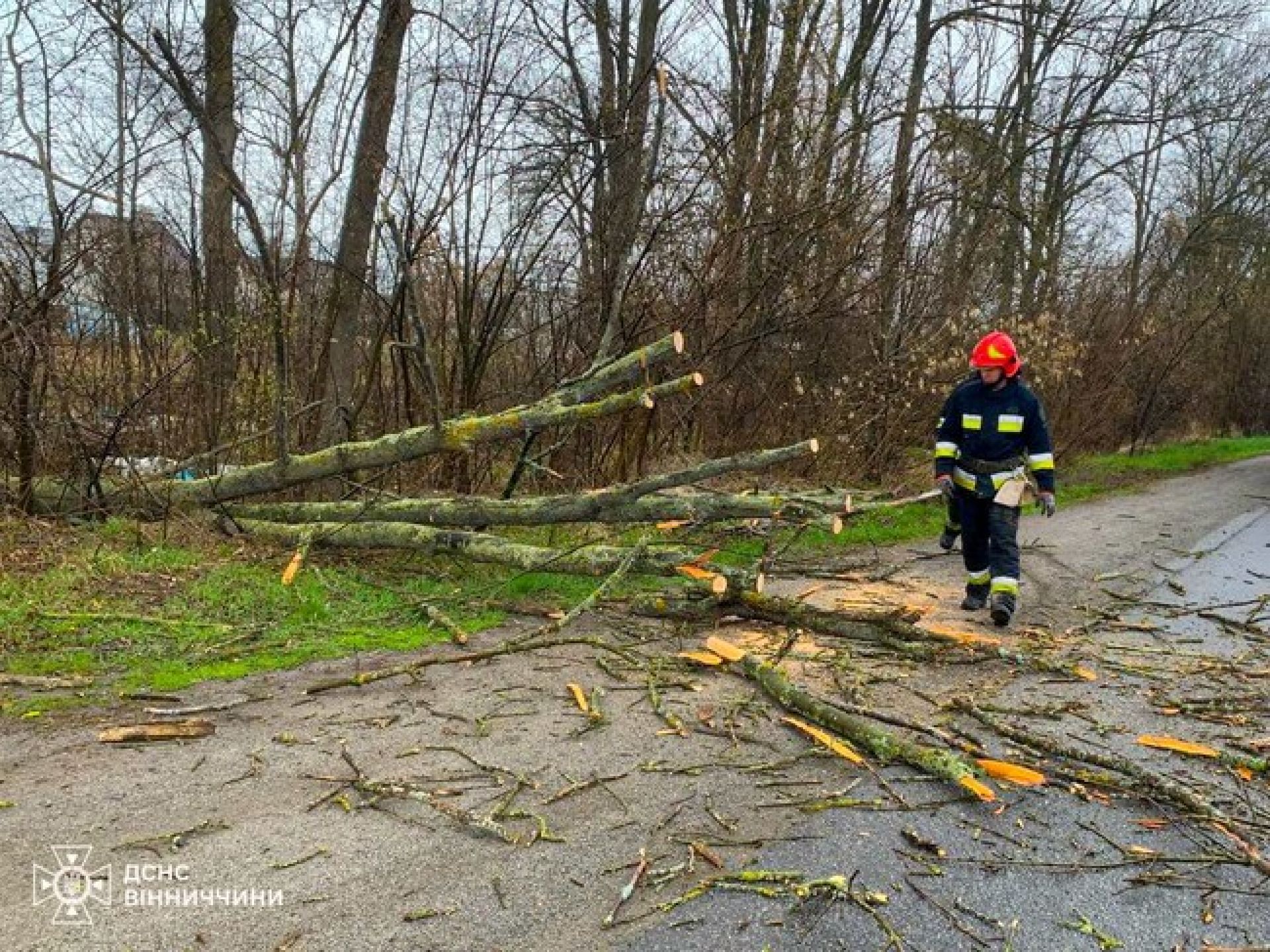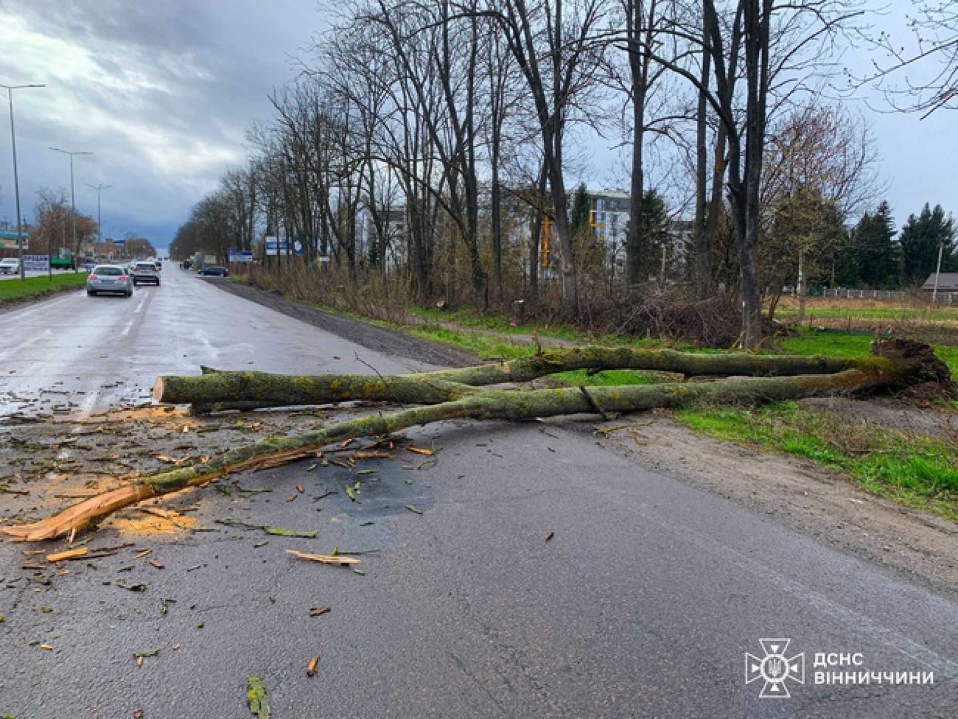 Шквальний вітер та мокрий сніг, що накрили область, вже встигли наробити лиха. Лише за останню добу бійці ДСНС дев’ять разів виїжджали на «двобій» із наслідками негоди. Повалені велетенські дерева перетворили дороги у Вінницькому, Гайсинському та Хмільницькому районах на справжні смуги перешкод.