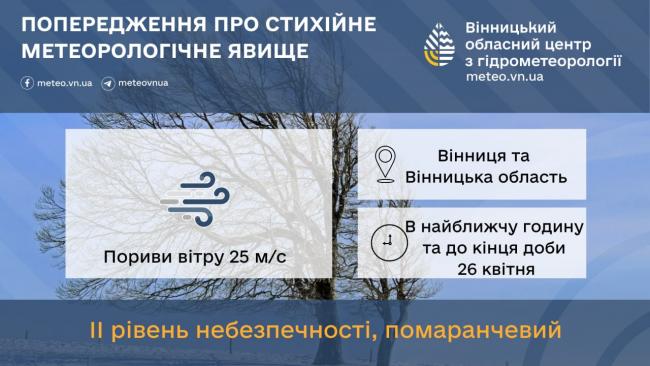 Синоптики попереджають, що негода лише посилюватиметься. За даними метеорологів, у найближчу годину та до кінця доби 26 квітня очікуються пориви вітру до 25 м/с.