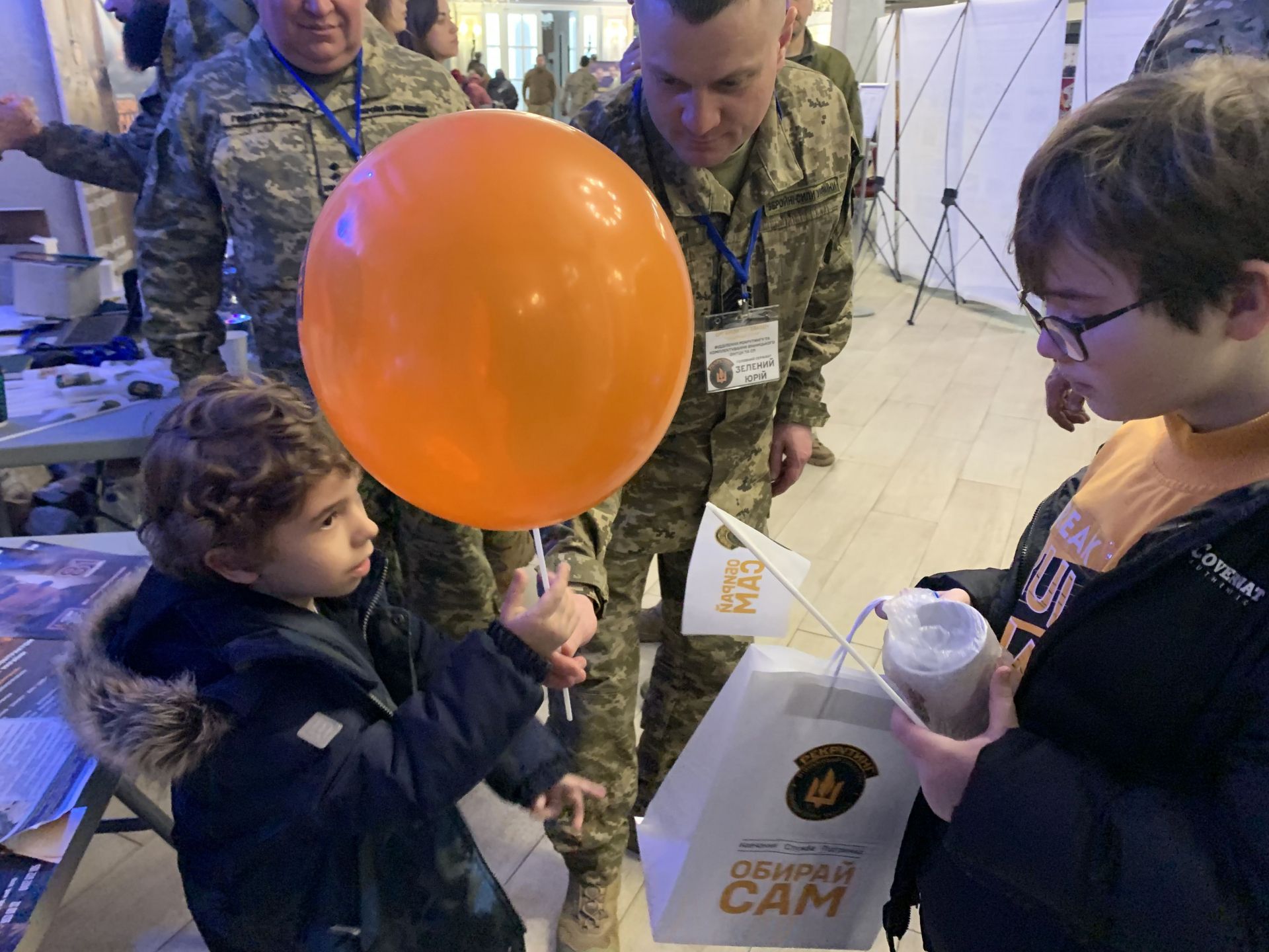 Жовтогарячі кульки і білі паперові пакети з написами «Обирай сам» в руках зграйки юних вінничан одразу кидалися в очі. Центр міста, неділя 25 лютого, ми йдемо на ярмарок військових вакансій, вони повертаються з нього, сміються, про щось розмовляють, активно жестикулюють руками, розмахують кульками.