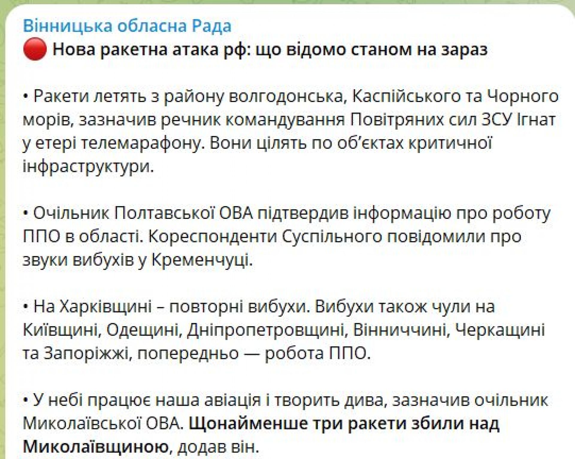 — Вибухи також чули на Київщині, Одещині, Дніпропетровщині, Вінниччині, Черкащині та Запоріжжі, попередньо — робота ППО, — зазначають у Вінницькій обласній раді.