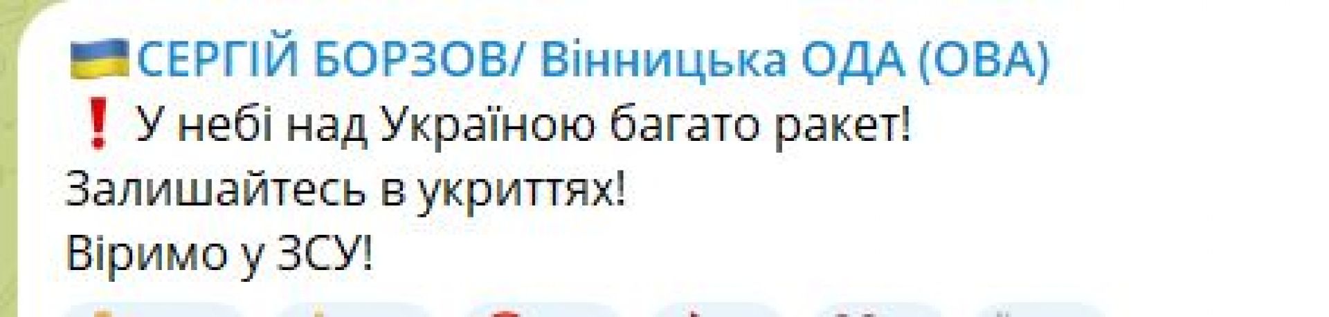 У небі над Україною багато ракет, застерегли в Вінницькій ОВА. Прохання залишатись в укриттях до відбою тривоги.