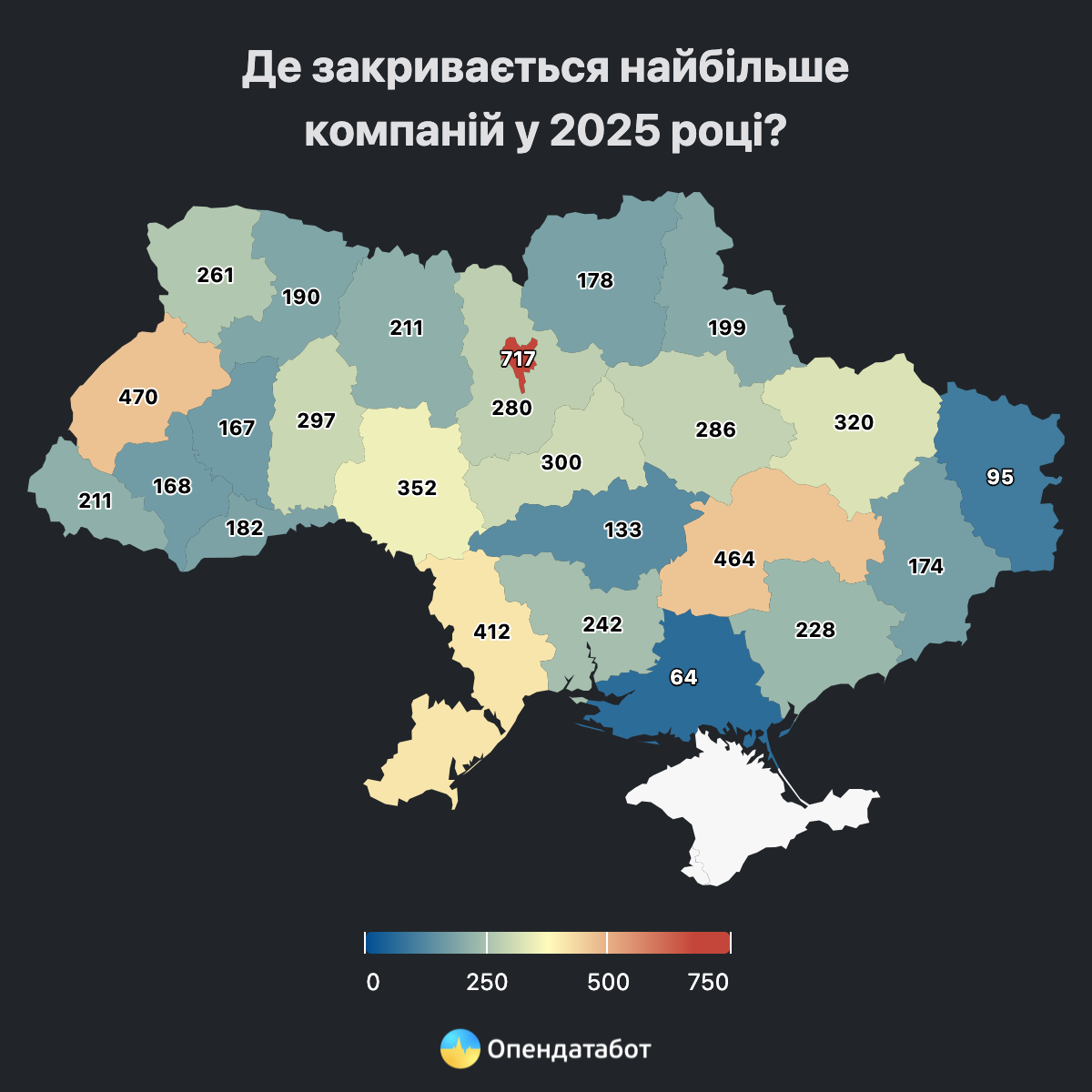 Водночас від початку року встигло закритись 6 тисяч 653 бізнесів. Найбільше закриттів у тих самих регіонах: Київ — 717 компаній, Львівщина — 470 підприємств, Дніпропетровщина — 464 компанії.