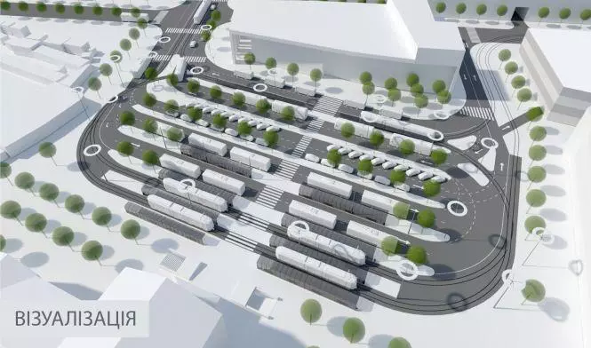 Площу перед Залізничним вокзалом поділять між лініями громадського транспорту. За півсотні метрів від головного входу зупинятиметься трамвай. Планується, що саме рейковий транспорт (дві лінії) буде найближчим до вокзалу. Потім, платформи розставлять у такій послідовності: тролейбус, автобус, таксі та смуга для приватного транспорту. А поблизу ТЦ — дві лінії приміського автобусу.