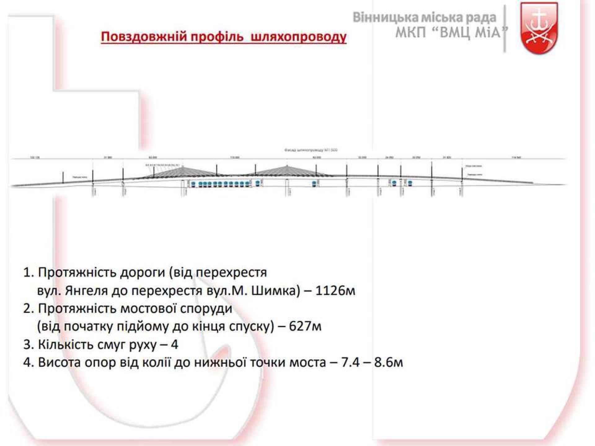 На минулому тижні, 22 березня, пройшло обговорення плану території під будівництво ще одного мосту, який з’єднає Замостя і Тяжилів. Проектанти розповіли вінничанам, що протяжність нової дороги від вулиці Янгеля до вулиці Ватутіна буде 1126 метрів. З них — 627 метрів — це підвісний міст.