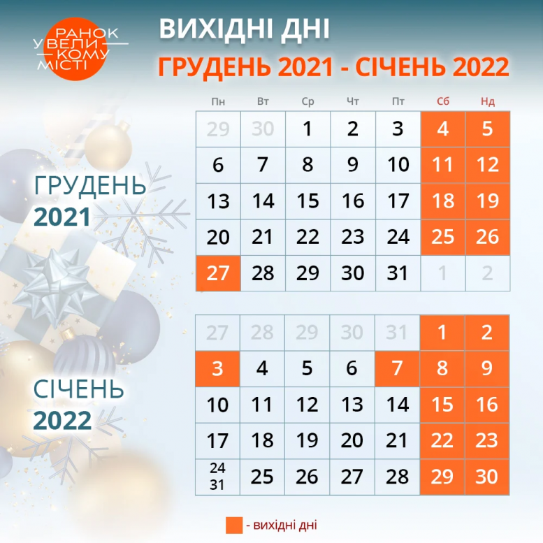 Перший вихідний на новорічні свята припаде на грудень. Ураїнці святкують два Різдва — 25 грудня за юліанським календарем (католицьке Різдво) та 7 січня за григоріанським календарем. І 25 грудня, і 7 січня в Україні оголошено вихідними. 25 грудня 2021 року випадає на суботу, вихідний день. Понеділок 27 грудня також оголошений неробочим днем. Тому відпочивати на католицьке Різдво українці будуть 25-27 грудня.