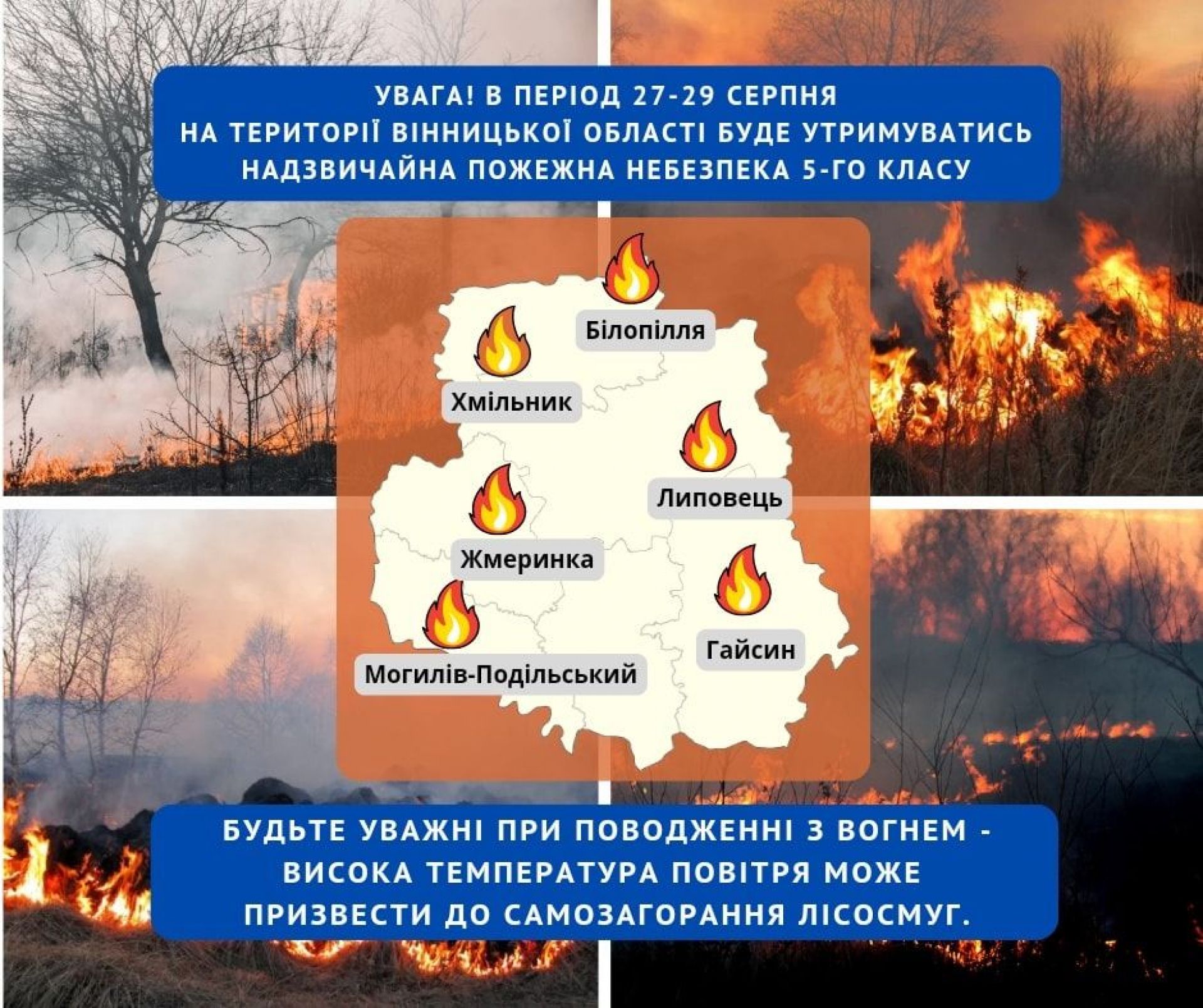 - За даними Вінницького обласного центру з гідрометеорології, 27-29 серпня на всій території області передбачається надзвичайна пожежна небезпека 5-го класу.