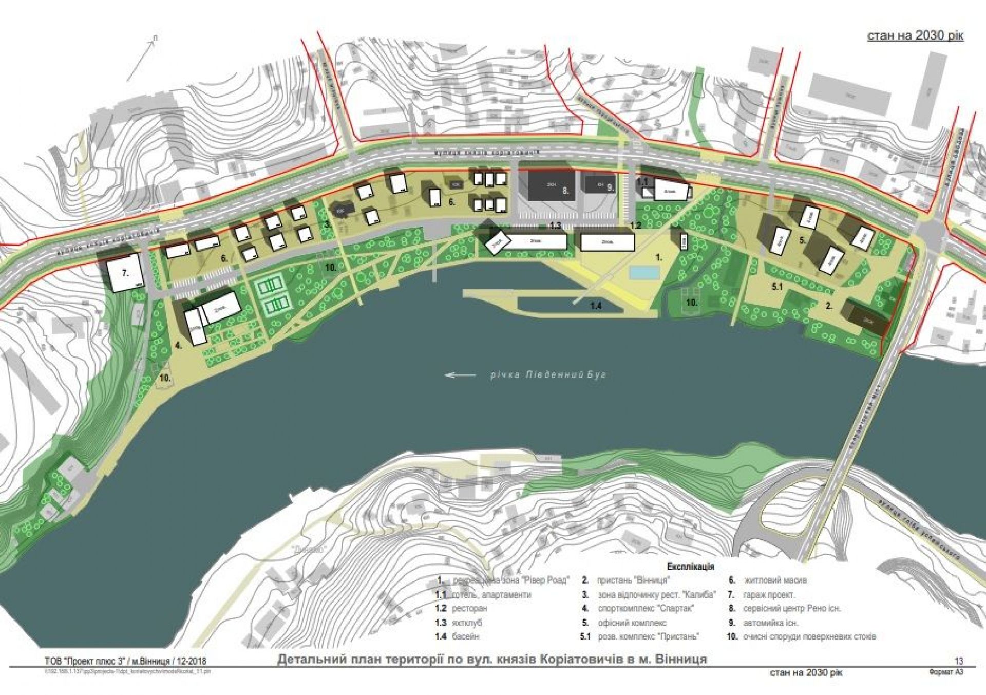 — Проектним планом передбачені зміни до 2030 року. Один з основних запроектованих об'єктів — рекреаційний комплекс. Він складається з пляжу, басейна в акваторії річки, відкритого басейна, ресторану, яхт-клубу і готелю. Це все розташовуємо за існуючим автосалоном «Рено», — каже Коротких. — Друга зона — це територія спортивного товариства. Там передбачене будівництво спортивного комплексу і реконструкція споруд «Спартака». Навпроти житлового масиву «Резиденція» існує проект чотириповерхового гаража-автостоянки.