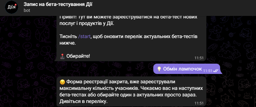 «Форма реєстрації закрита, вже зареєстрували максимальну кількість учасників», — пише телеграм-бот «Дії».