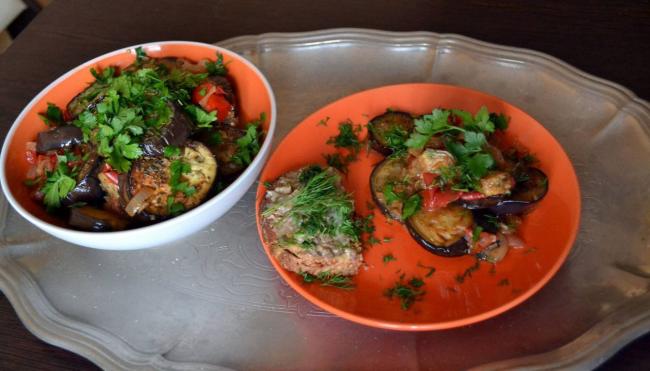 Приготування. Спочатку нарізаєте гарними кружальцями баклажан, широко, приблизно по сантиметру. Замочуємо в солоній воді на 15 хвилин. Далі трохи обсушуємо та добре обсмажуємо. Але не лиймо багато олії, хай вони будуть зі скоринкою. Викладаємо на велику таріль.