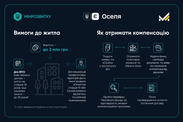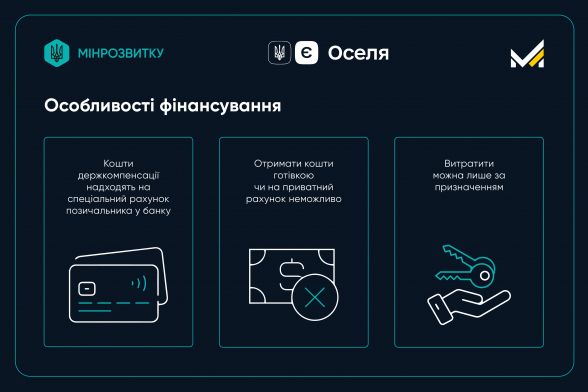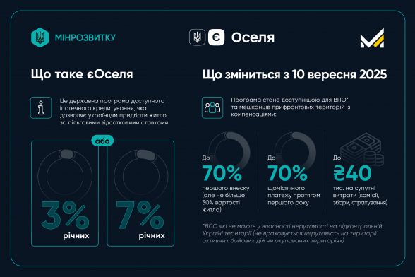 Люди зможуть отримати пільгову іпотеку під 3% або 7% річних. Водночас при сплаті першого внеску за житло люди можуть отримати до 70% компенсації цього платежу (не більше 30% від вартості житла) та до 70% компенсації щомісячного платежу в перший рік дії іпотеки. А ще компенсацію до 40 тисяч гривень на супутні витрати (це комісії, збори, страхування тощо).