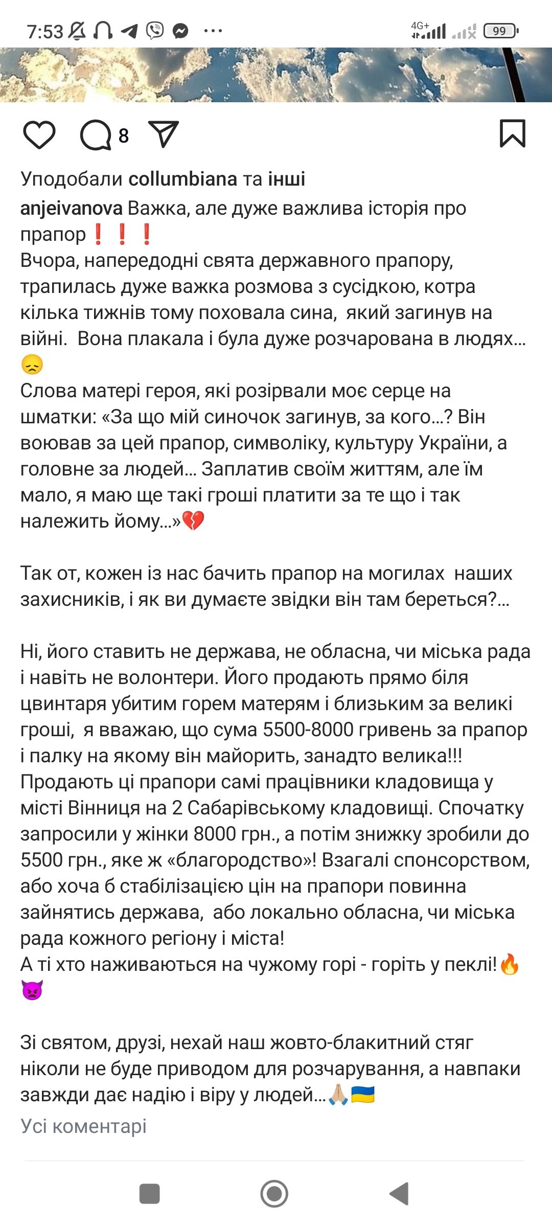 Так от кожен з нас бачить прапор наших захисників, і як ви думаєте, звідки він там береться. Ні, його ставить не держава, не обласна чи міська рада, і навіть не волонтери. Його продають біля цвинтаря убитим горем матерям і близьким за великі гроші, я вважаю що сума 5500-8000 грн за прапор і палку, на якому він майорить, занадто велика. Продають ці прапори самі працівники кладовища, у місті Вінниця на 2 Сабарівському кладовищу. Спочатку запросили у жінки 8000 тисяч, потім зробили знижку 5500. Взагалі спонсорством або хоча б стабілізацією цін на прапори повинна займатися держава, або локально обласна чи міська рада. А хто наживається на чужому горі — горіть у пеклі».