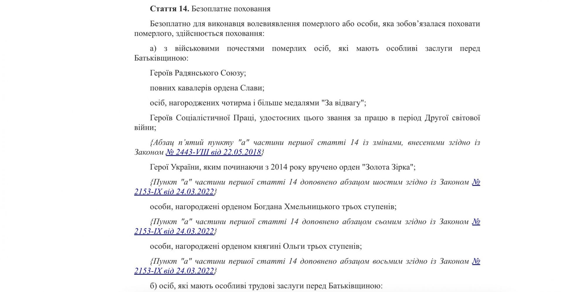Є закон України «Про поховання і похоронну справу», де прописані пункти, хто на що має право. І там цікаво:
