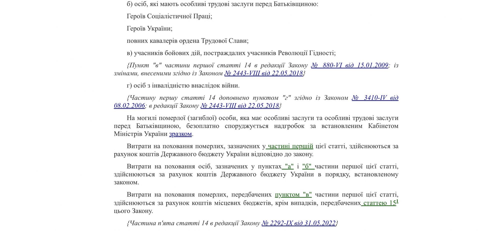 Є також інструкція від ветеранської організації, яка звучить наступним чином: «Пам’ятка щодо організації поховання загиблих військовослужбовців, які мають особливі заслуги перед батьківщиною, учасників бойових дій, постраждалих учасників революції Гідності та осіб з інвалідністю внаслідок війни».