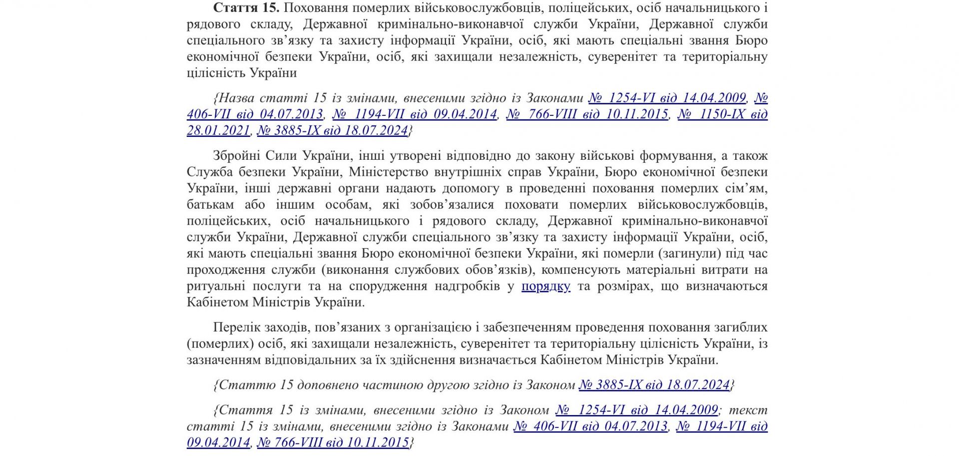А на сайті міноборони є про «Виплати допомоги на поховання військовослужбовців». Де, зокрема, сказано: Сім’ям і батькам військовослужбовців, які загинули (померли) під час проходження військової служби, надається допомога в проведенні поховання і компенсуються матеріальні витрати на ритуальні послуги та спорудження надгробків у розмірі п’яти прожиткових мінімумів у розрахунку на місяць на одну особу, установлених законом на дату загибелі (смерті) військовослужбовця. Розмір допомоги визначається виходячи із показника прожиткового мінімуму на дату смерті (загибелі).