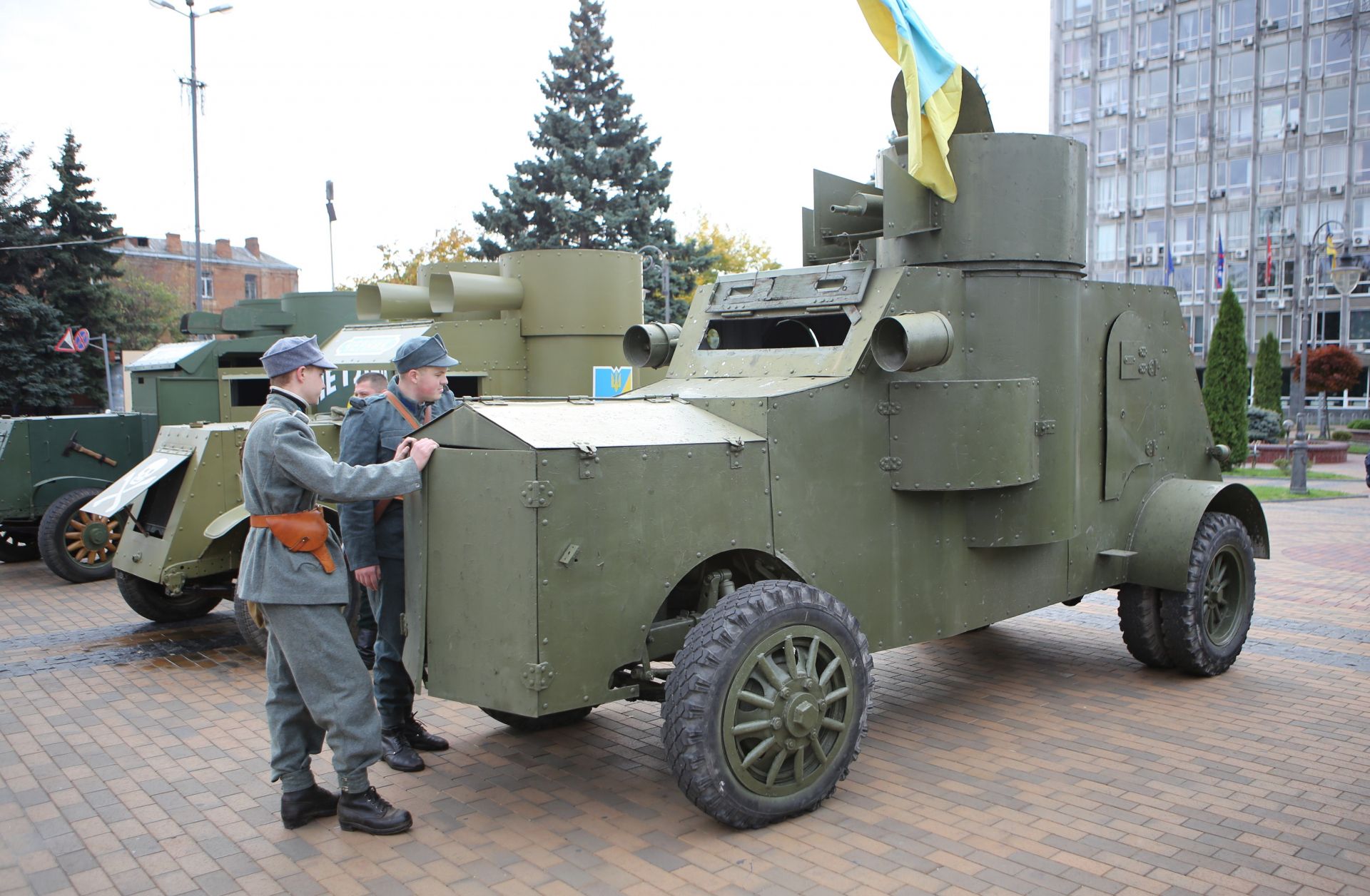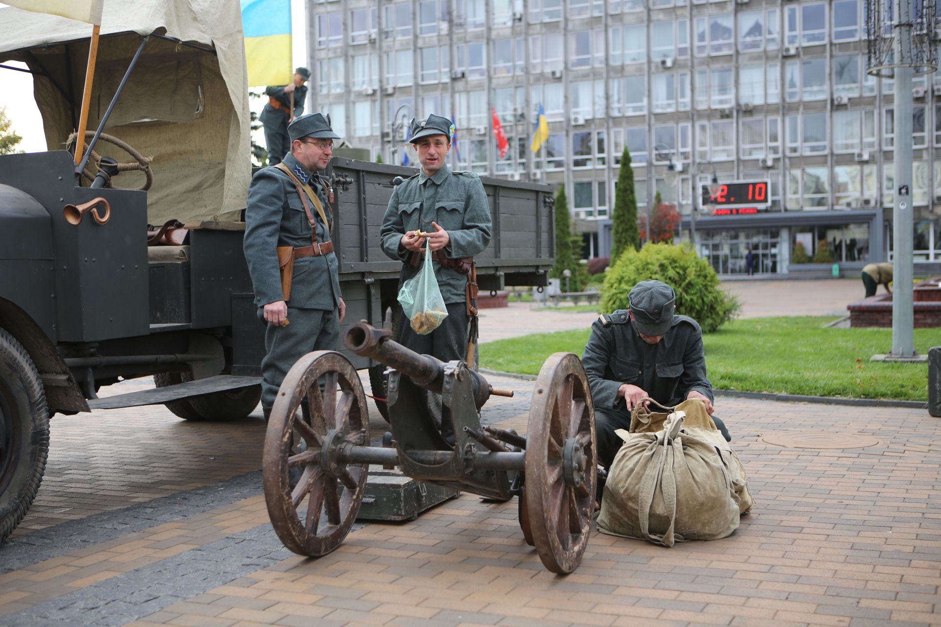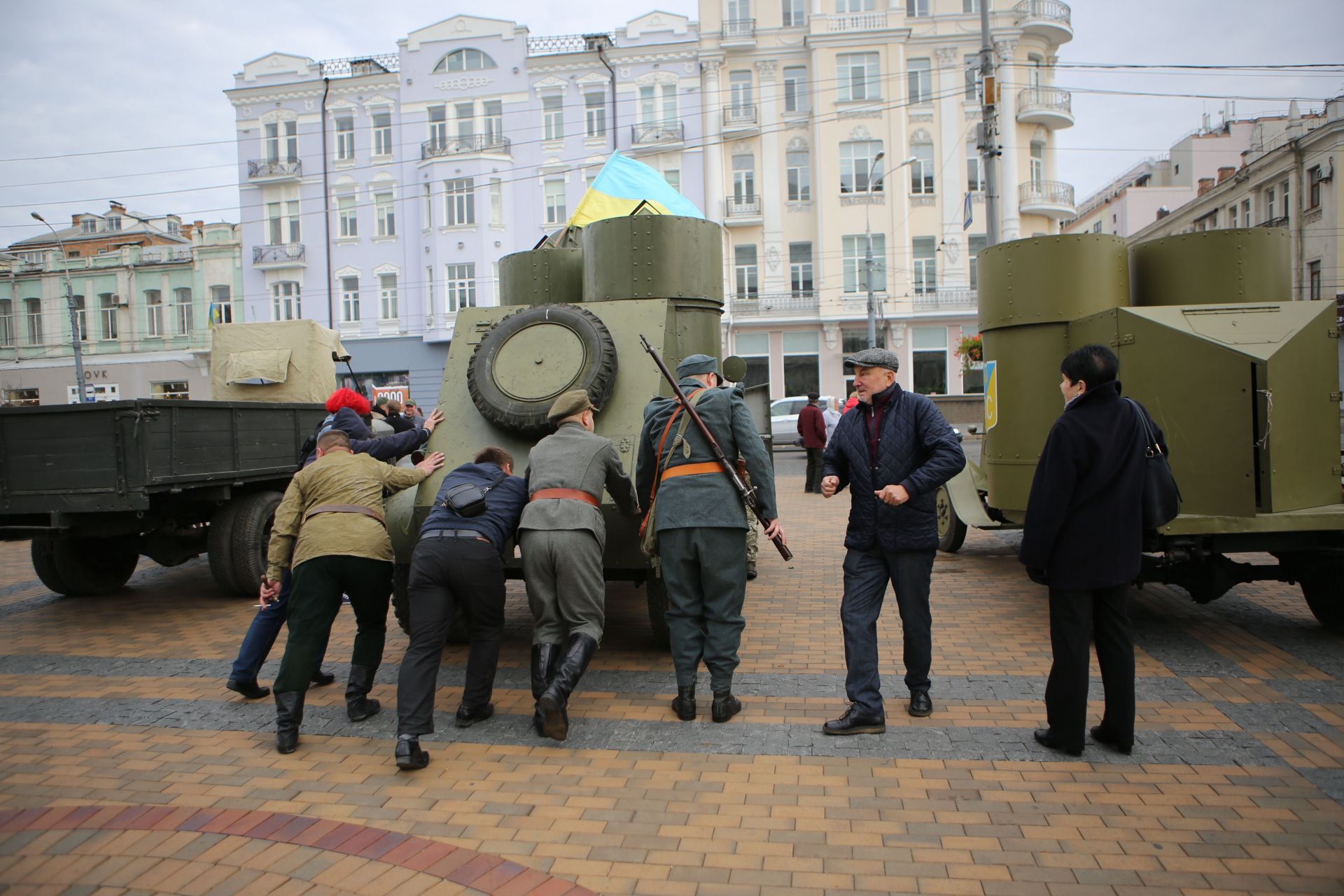 О 10.00 на майдан Незалежності приїхали три панцерники, вантажівка та зо два десятки людей — реконструкторів історії, які були в формі військових 100-річної давності.