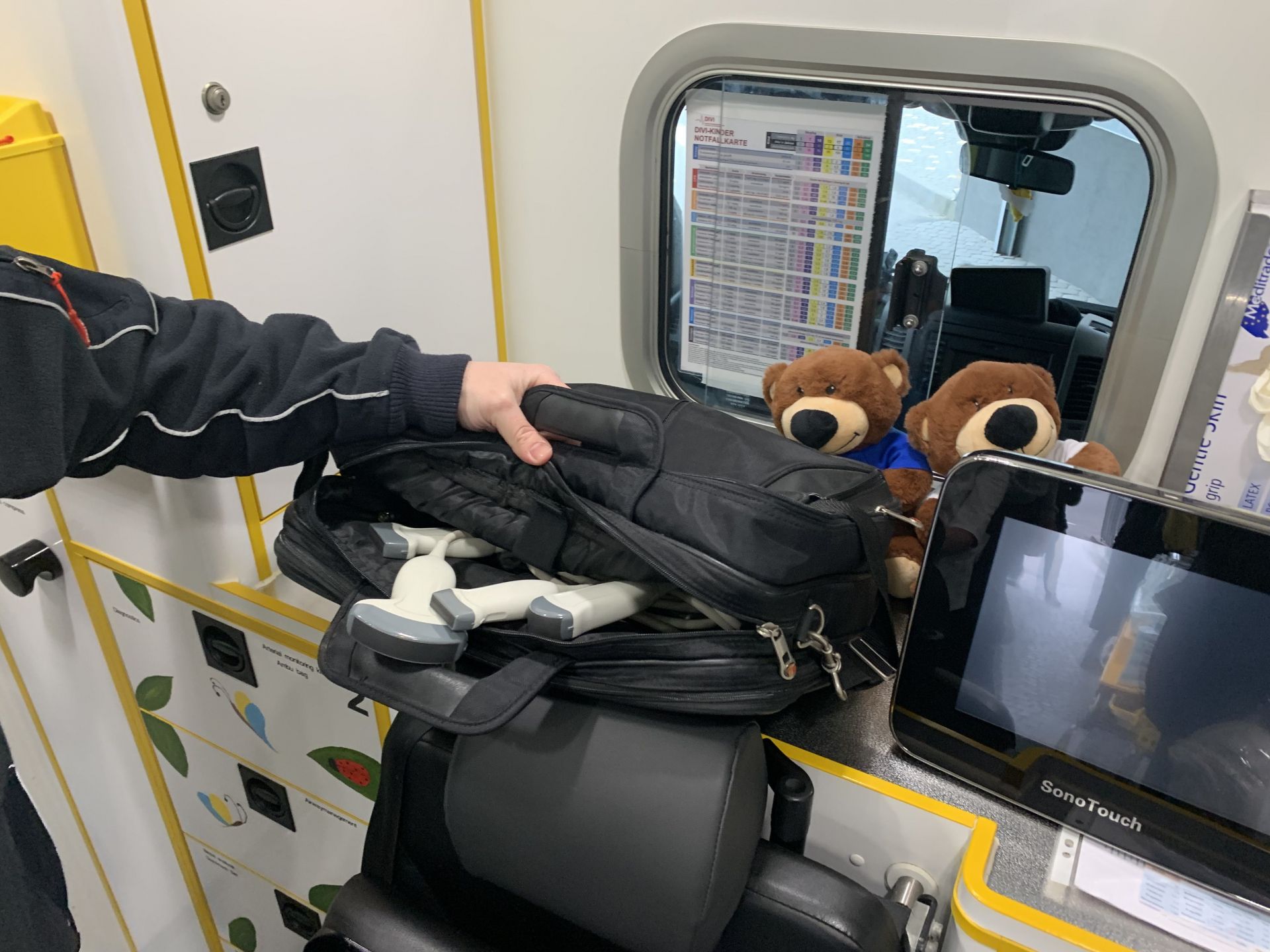 А ще хірургічні набори для забезпечення прохідності дихальних шляхів. Є можливість зробити всі аналізи, принтер щоб роздрукувати результати аналізів, і інтернет, завдяки якому ці аналізи можна передати в шпиталь, який очікує пацієнта, або для консультації. Не кажучи вже про всі можливі витратні матеріали.