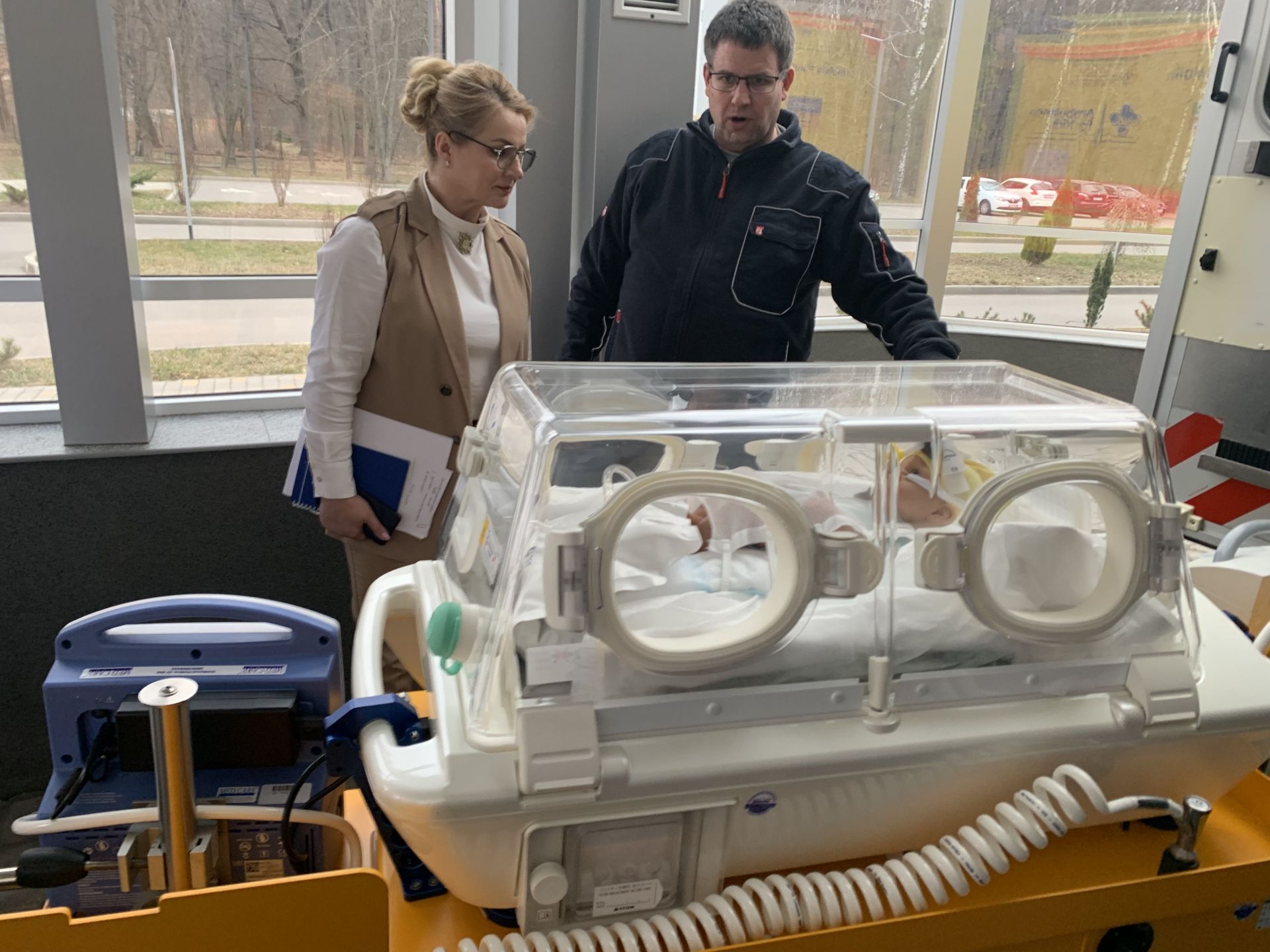 — На цій платформі встановлені інкубатори останньої модифікації для недоношених діток, які пристосовані на довгі транспортування. Тут можлива фіксація дитини за допомогою спеціальної сітки і додаткової пневмоподушки. Навіть якщо автівка перевернеться дитина буде в безпеці. Інкубатор також має пневмопідвіску, щоб пом’якшувати нерівності наших доріг, (втім, пневмопідвіску має і машина загалом). І все це за п’ять хвилин може трансформуватися в місця для більш старших пацієнтів. Ну і максимальна автоматизація, натискаєш на кнопку, потягнув за ручку і платформа виїхала на зовні.