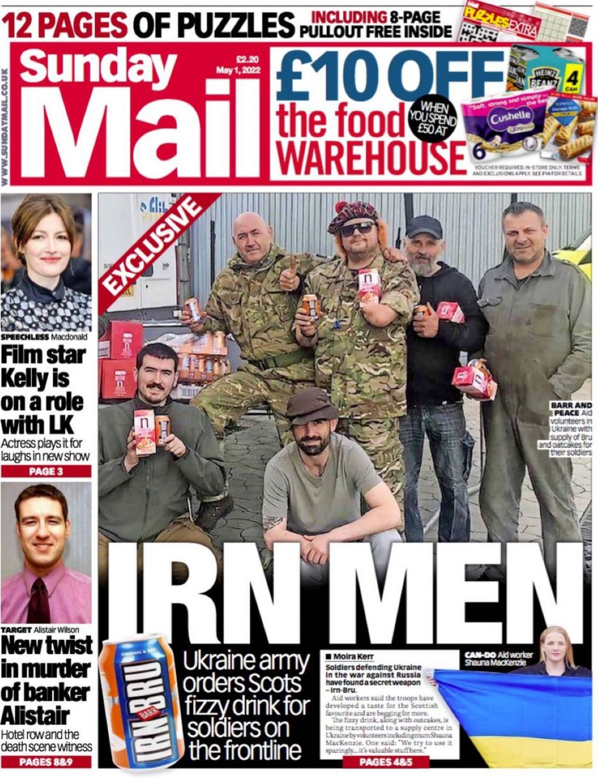 «The Sunday Mail» пише, що Irn-Bru* став фаворитом серед українських солдатів, які борються з російськими військами. Солдати «просять його більше» у співробітників гуманітарної допомоги, пише газета.