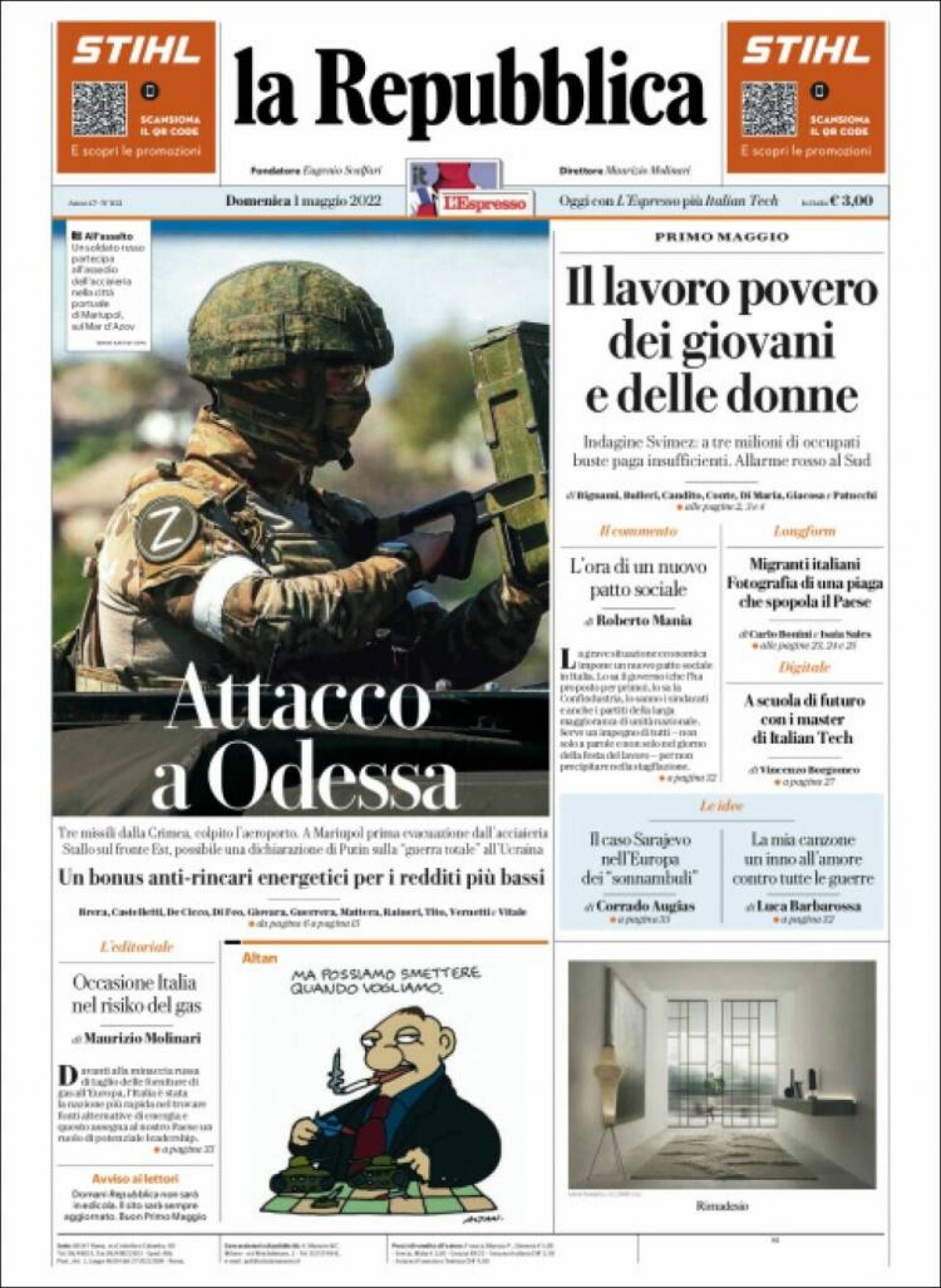 Італія. "Атака на Одесу" — заголовок в "La Repubblica": «Три ракети з Криму потрапили до аеропорту.