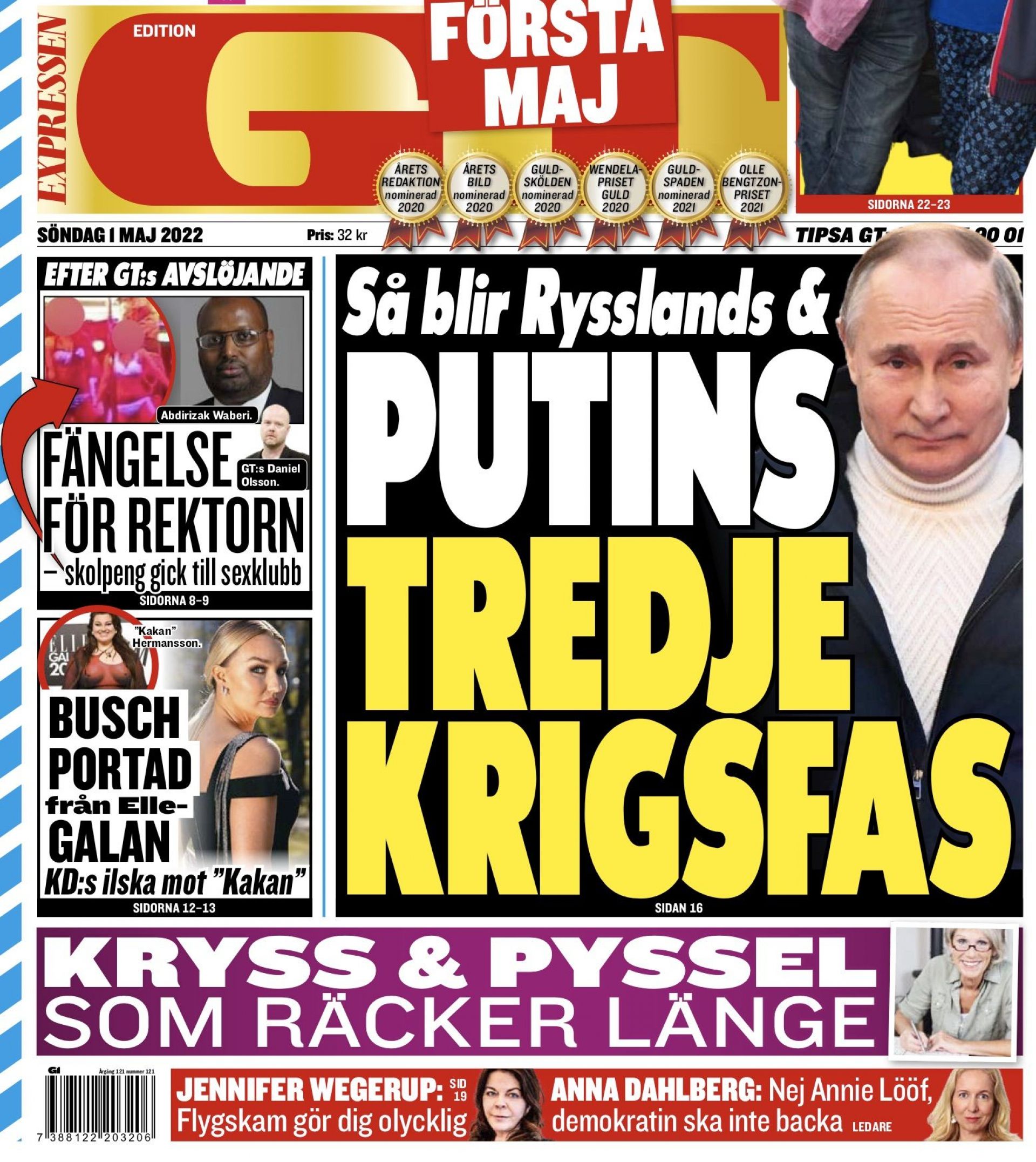 Швеція. «GÖTEBORGSTIDNINGEN», вийшла с заголовками на фото: «ТРЕТЯ ФАЗА ВІЙНИ ПУТІНА»