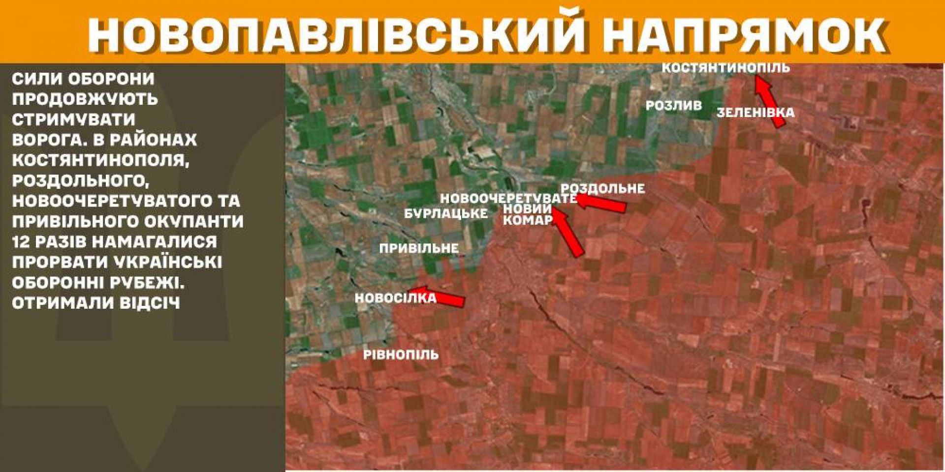 Сили оборони продовжують стримувати ворога на Новопавлівському напрямку. В районах Костянтинополя, Роздольного, Новоочеретуватого та Привільного окупанти 12 разів намагалися прорвати українські оборонні рубежі. Отримали відсіч.