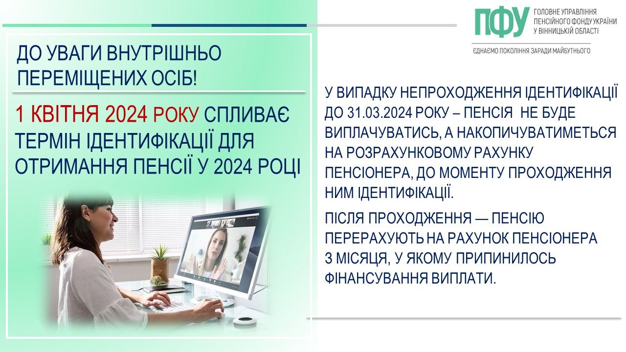 Головне управління Пенсійного фонду України у Вінницькій області звертає увагу на те, що для отримання виплат у 2024 році внутрішньо переміщені особи мають пройти ідентифікацію в АТ «Ощадбанк» або в Пенсійному фонді України до 31 березня 2024 року.
