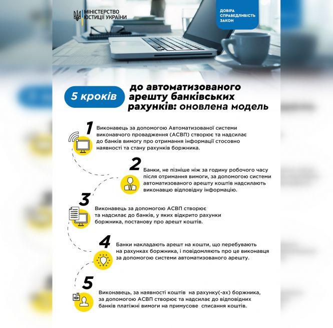 У Міністерстві юстиції повідомили, що державна виконавча служба тепер зможе отримувати інформацію про всі рахунки боржників в будь-якому з 73 банків України. І якщо суд ухвалить постанову про стягнення коштів та передасть справу на ДВС, то заборгованість буде списуватись автоматично з банківського рахунку боржника. Якщо наявної суми не вистачить, то рахунок буде заблокований до повного виконання рішення суду.