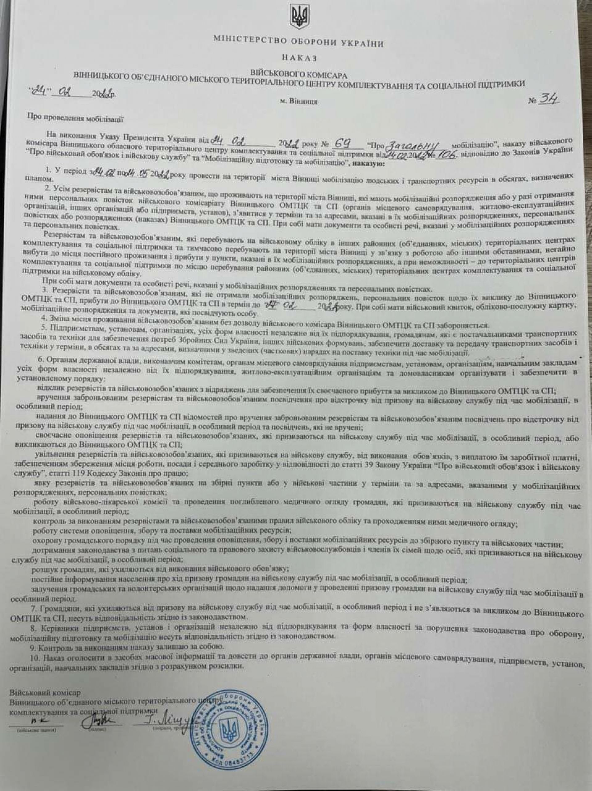 З'явився документ про мобілізацію на Вінниччині з 24.02 по 24.05. Мобілізація має проводитися протягом 90 діб із дня набрання чинності.