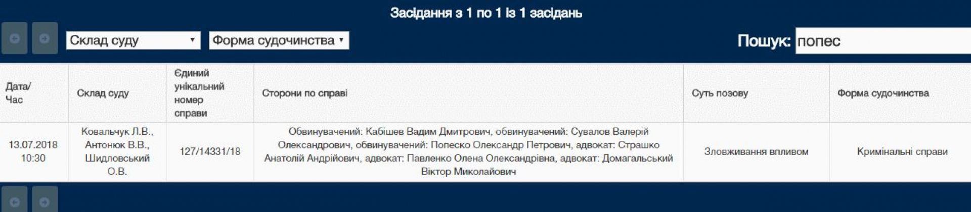 Сьогодні, 13 липня, Вінницький міський суд мав почати розгляд резонансної справи про хабарництво екс-заступника прокурора області Олександра Попеска. Підготовче засідання було заплановано на 10:30. Судді: Лариса Ковальчук, Василь Антонюк та Олексій Шидловський.