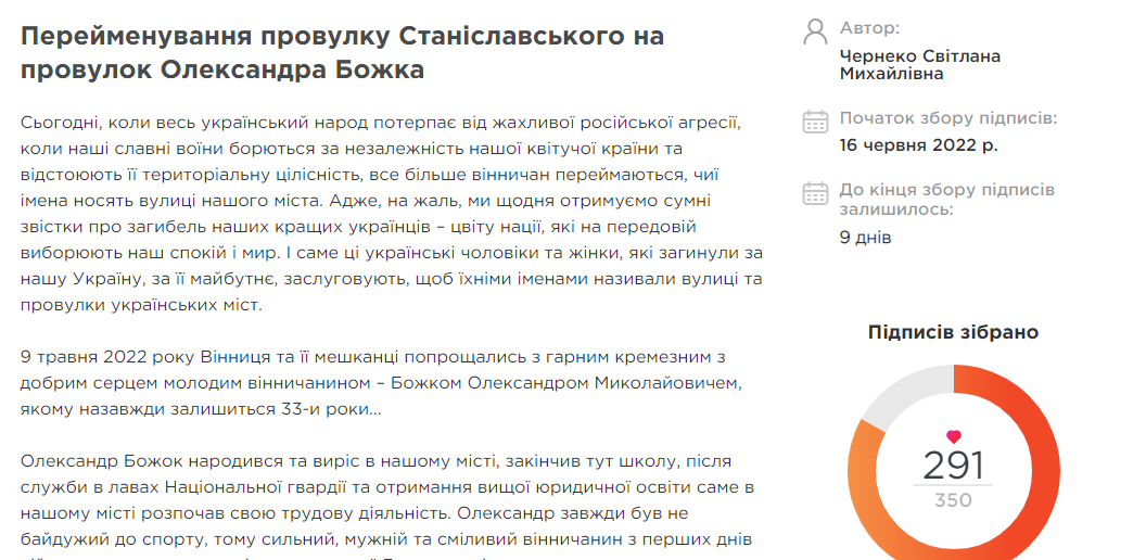 - На сайті вінницької мерії оприлюднили електронну петицію під назвою «Перейменування провулку Станіславського на провулок Олександра Божка».