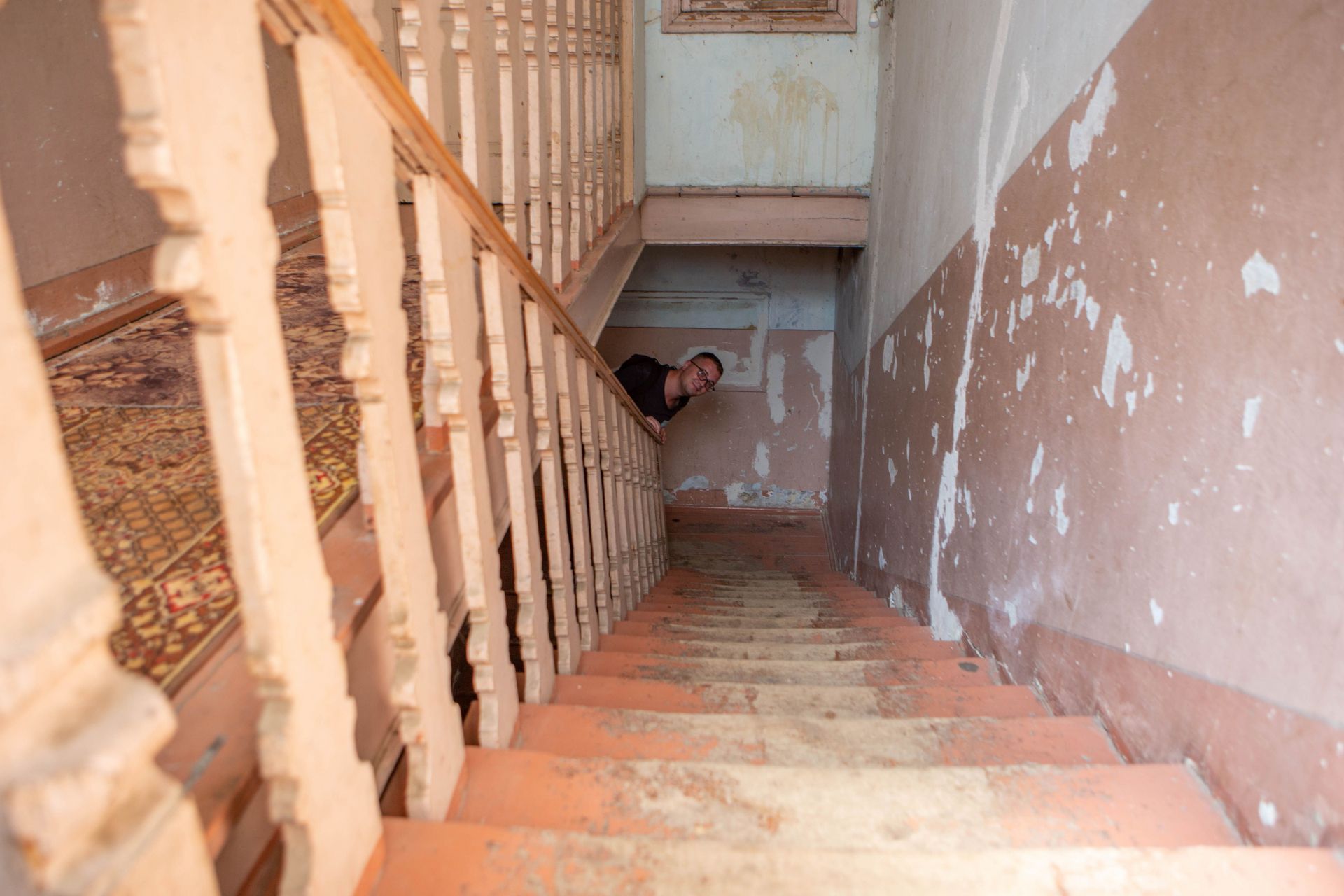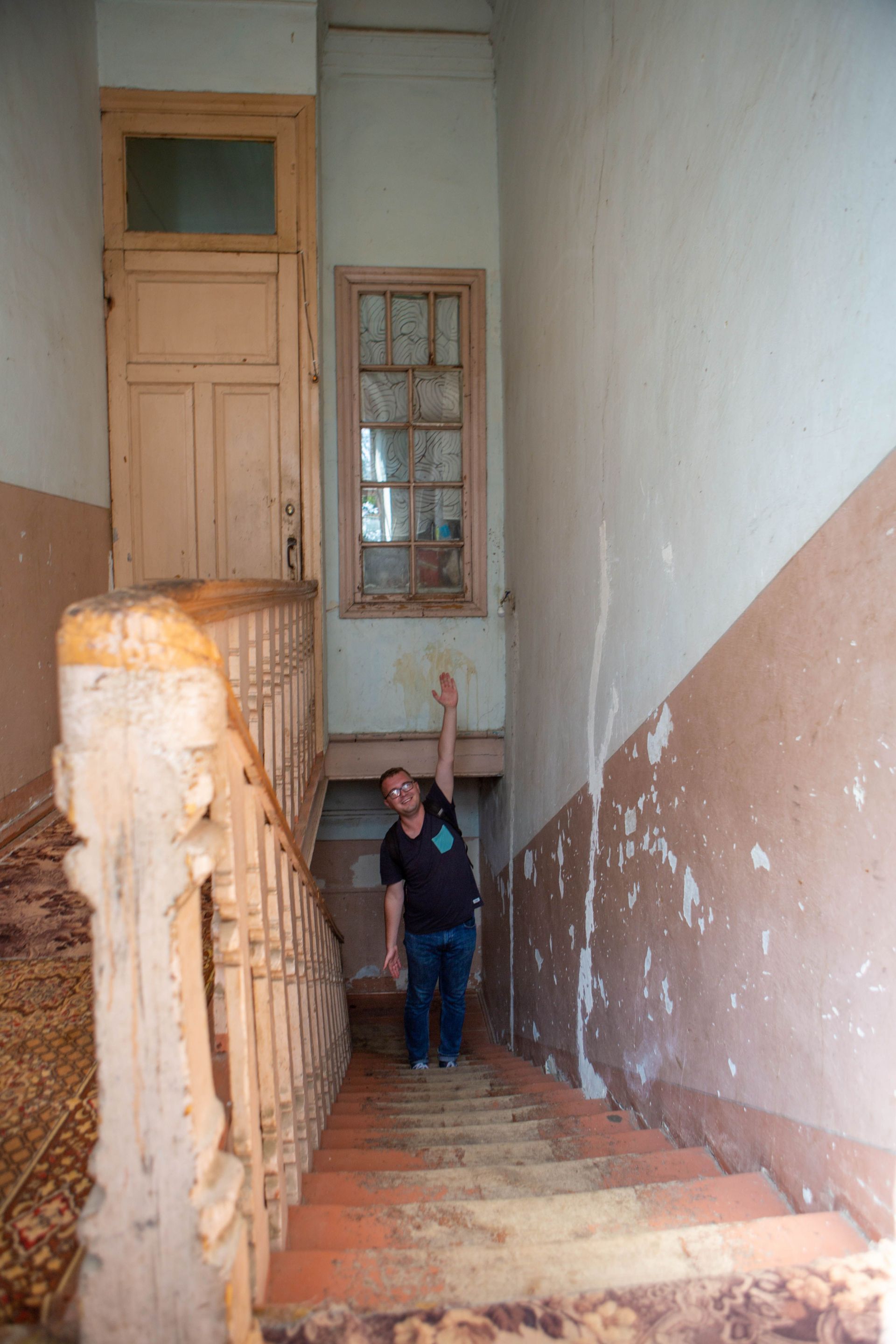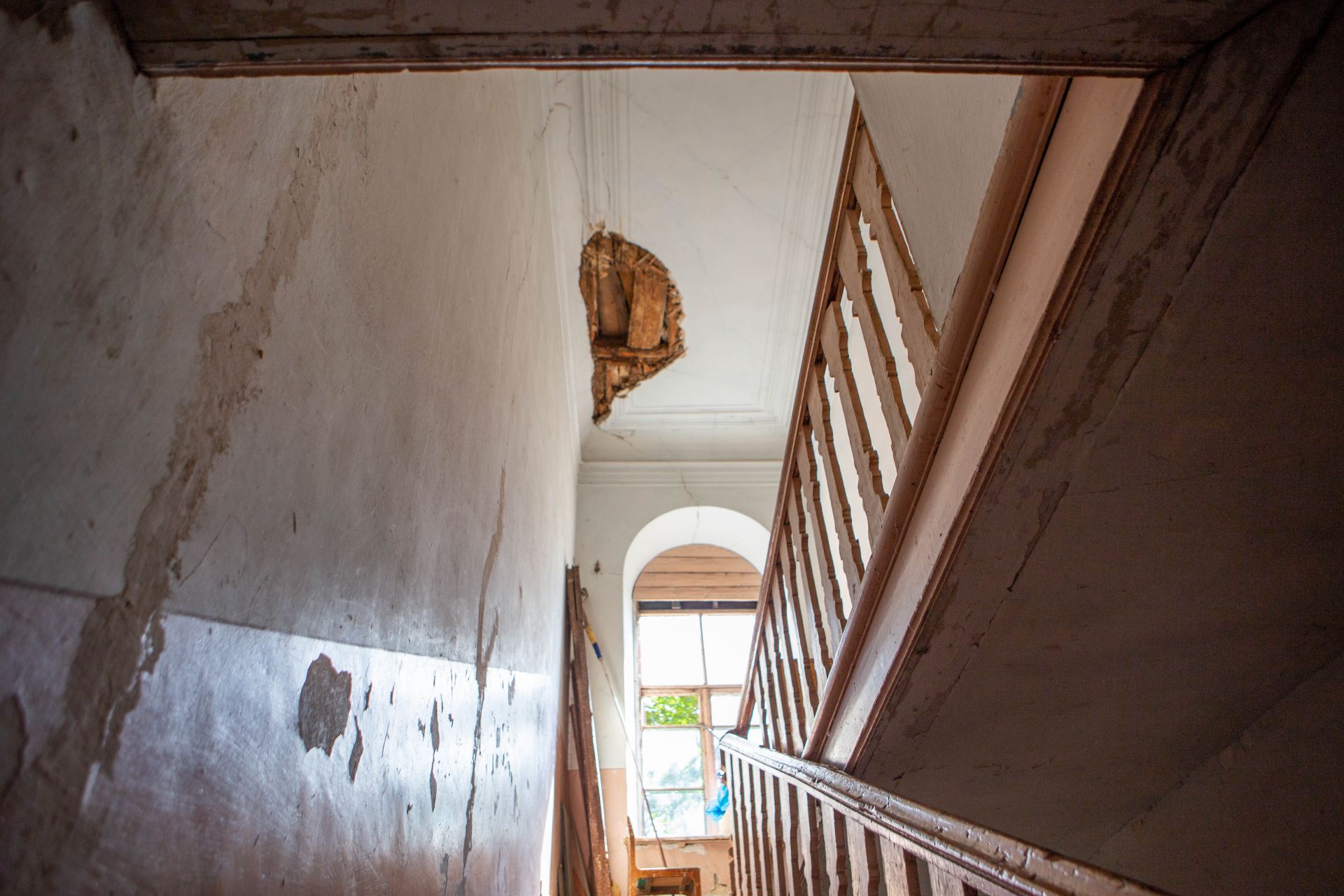 А стан одного з під’їздів будинку взагалі не сходиться з образом палацу: фарба та штукатурка на стінах полущилася, дерев’яні сходи та поручні місцями потріскалися, а в стелі видніються діри.