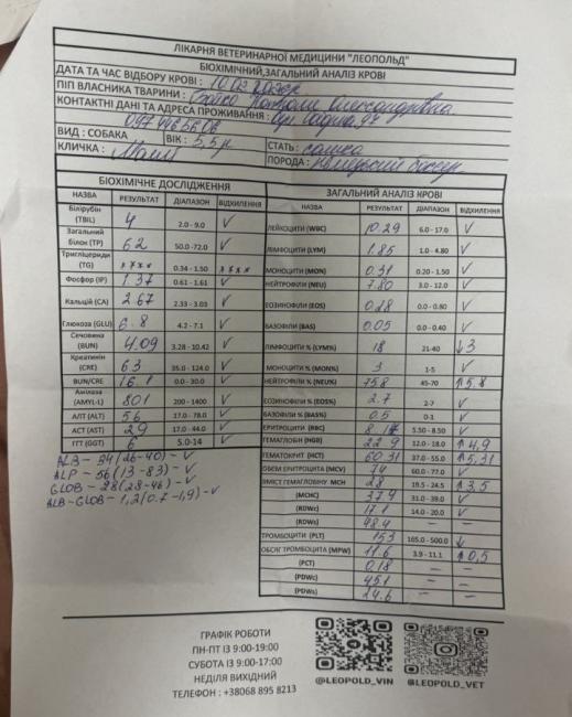 За словами ветеринарного лікаря, до якого власники звернулися пізніше, ще перед операцією у результатах аналізів були тривожні показники. Зокрема, рівень гематокриту становив 60,31%, а гемоглобіну — 22,9 г/дл, що значно перевищує норму. Такі значення свідчать про надто «густу» кров, яка створює серйозне навантаження на серце та може порушувати мікроциркуляцію в органах.
