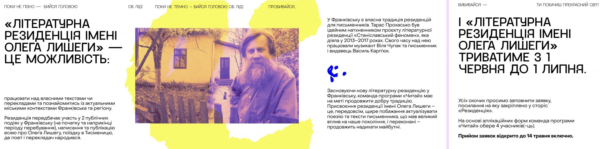 - Програма «Читай» в межах платформи «Тепле місто» організовує першу «Літературну резиденцію імені Олега Лишеги».