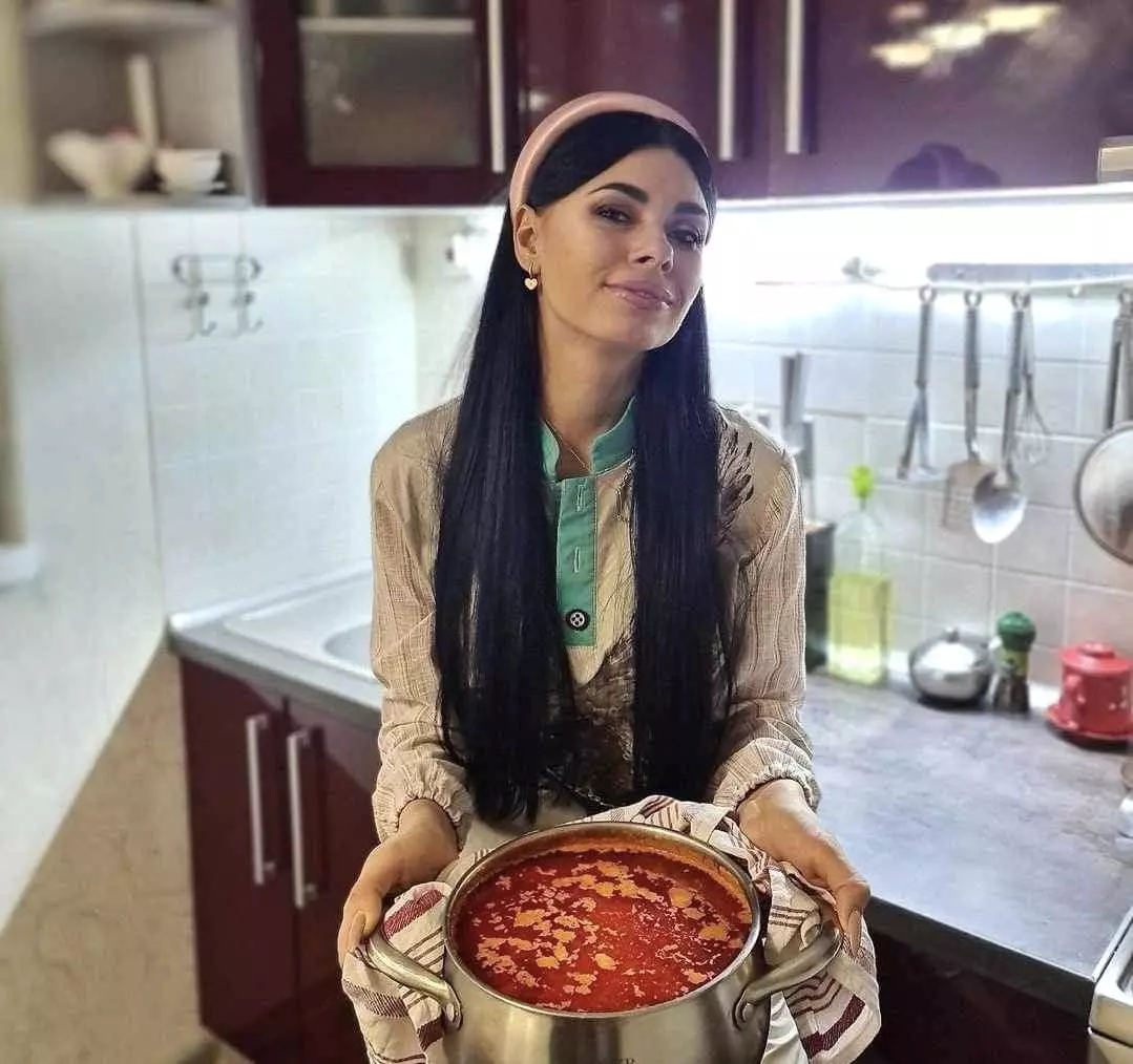 Інгредієнти на 3 л води: 7−8 картоплин,0,5 стакана червоної сочевиці,1 морквина,1 буряк, капустина свіжа + квашена — близько 300 г, 1 цибулина,1 невелика солодка перчина,1 свіжий томат, 2-3 зубчики часнику, 2 ст. ложки томатної пасти, чорний перець, сіль, лавровий лист, свіжа зелень — до смаку, олія для смаження.