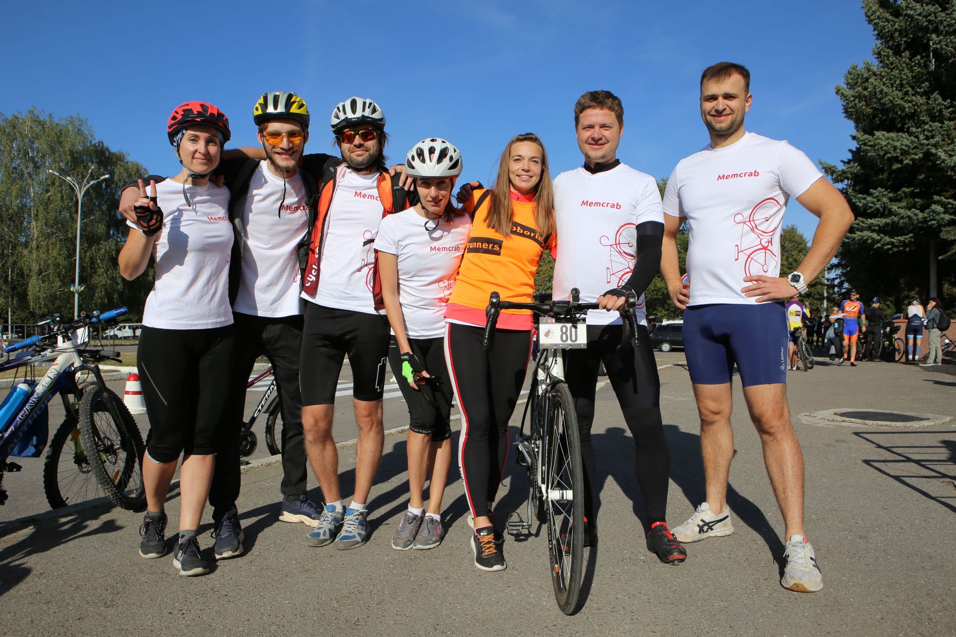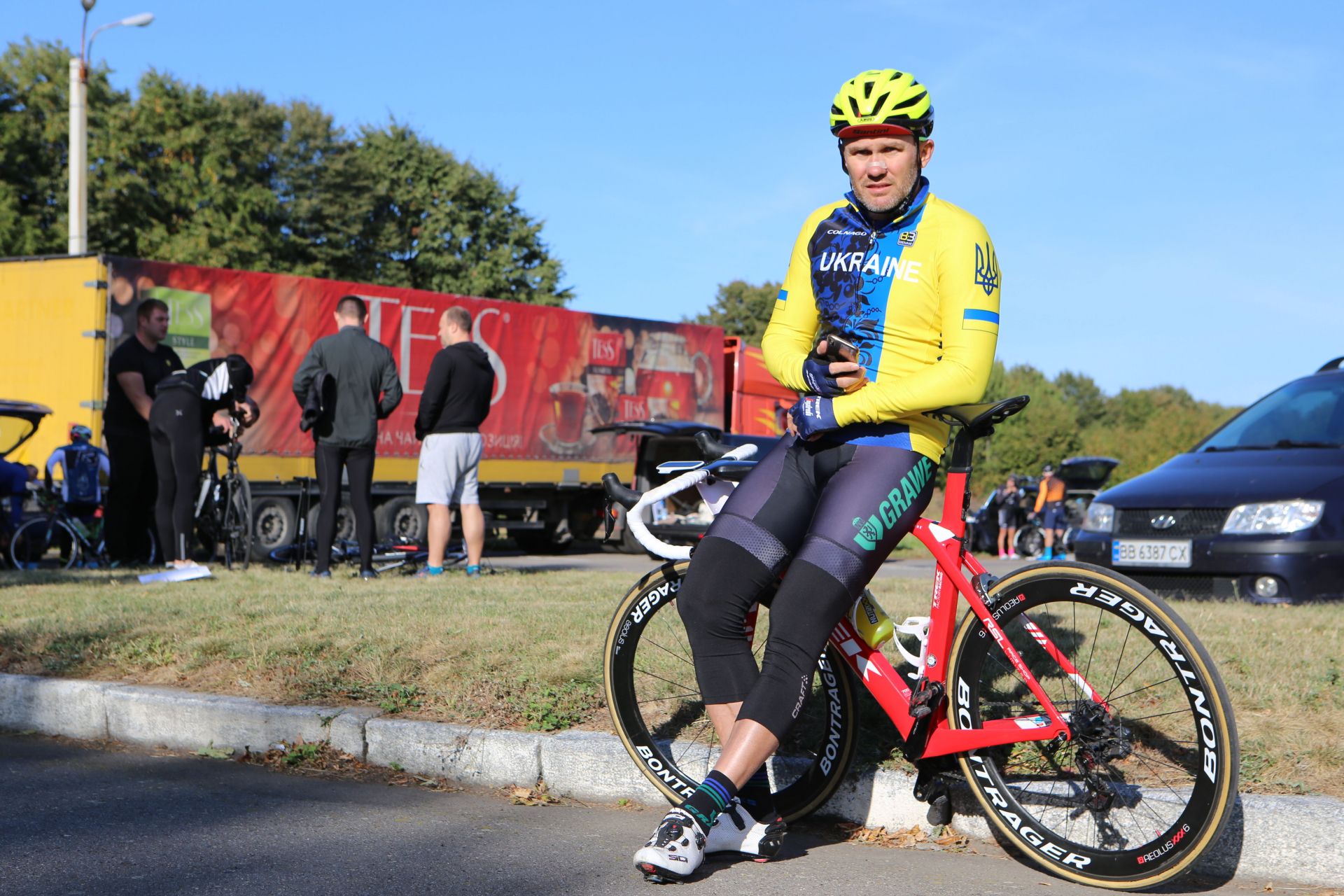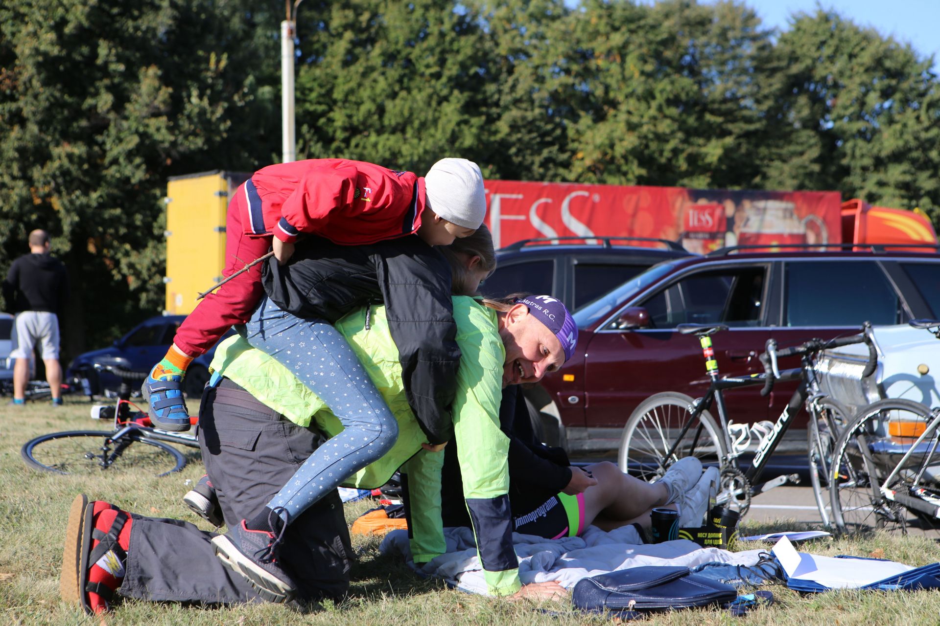 На автопарковці людей хоч і менше, ніж біля намету реєстрації, але життя тут вирує. Десятки учасників збирають свої велосипеди, клеять номерки на одяг, щось активно обговорюють, або просто бавляться зі своїми дітьми, яких, до слова, на заході було з десяток.