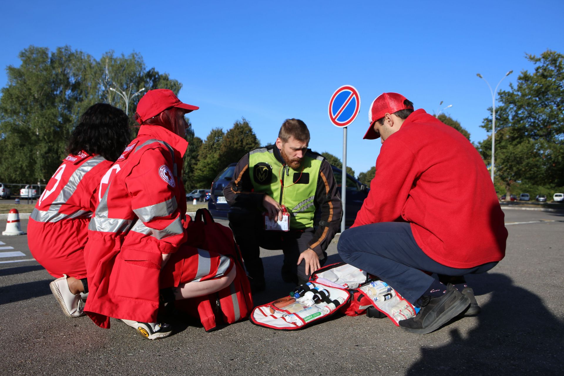 До летовища приїжджає «карета швидкої», майже одночасно з ними, з іншого боку з’являються працівники «Червоного хреста». Один з присутніх велосипедистів радіє їхньому приходу, жартома називаючи «червоними шапочками».