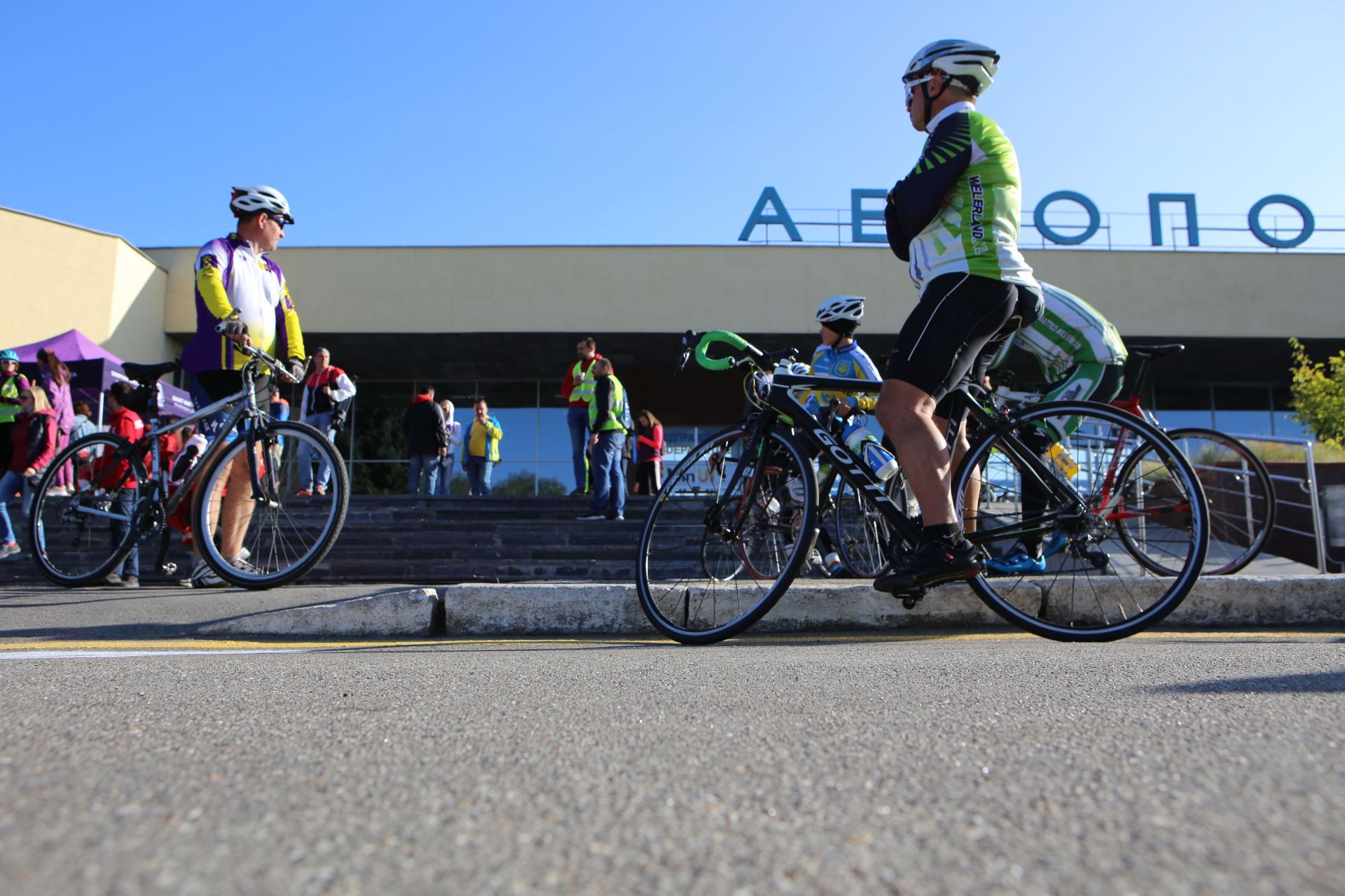 Приблизно за сто метрів від приміщення аеропорту кілька волонтерів встановлювали арку, що в неї велосипедисти будуть фінішувати. Поки її розкладали і накачували електронасосами, на дорозі вишикувалась черга з автомобілів і велосипедистів, які не мали можливості проїхати.