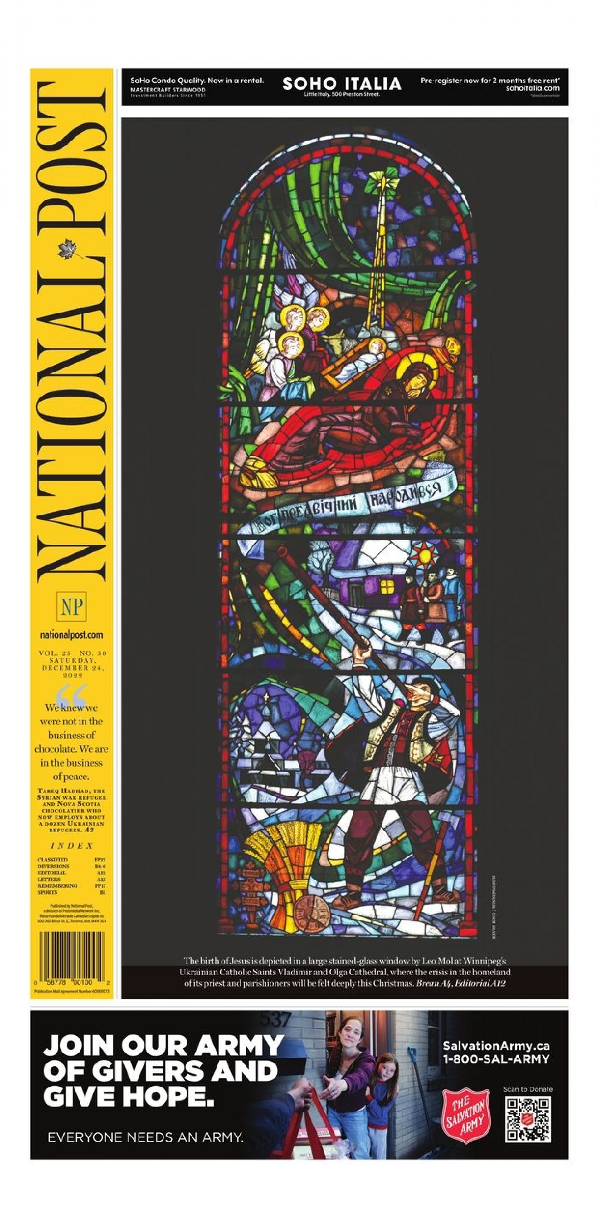 Фото: Народження Ісуса на великому вітражі в українському католицькому соборі Святих Володимира та Ольги у Вінніпезі, де цього Різдва глибоко відчуватиметься криза на батьківщині його священника та парафіян.