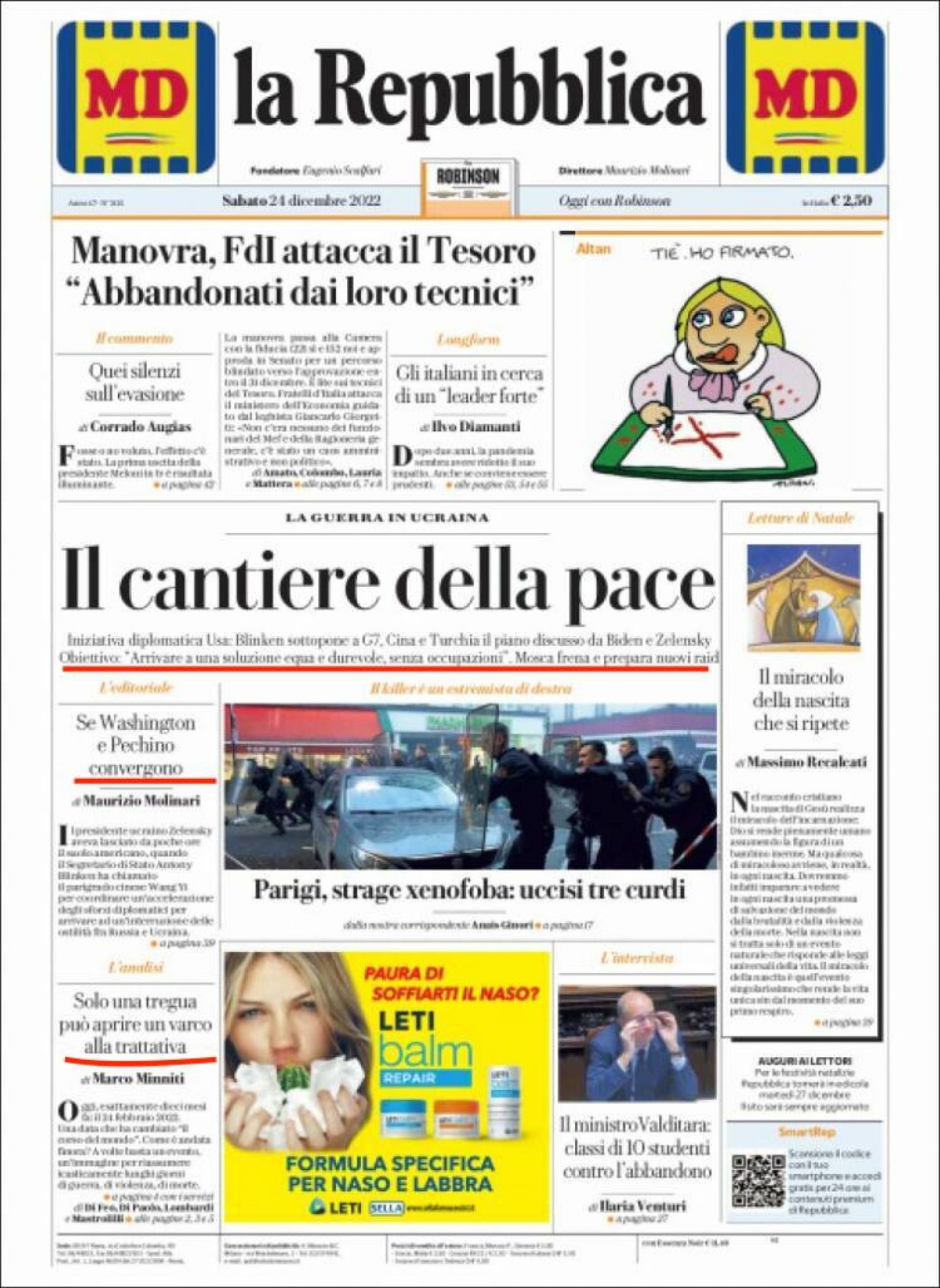 "Війна в Україні". «Дипломатична ініціатива США: Блінкен представляє план, який обговорюють Байден і Зеленський, у «Велику сімку», Китай і Туреччину». Завдання: «Досягти справедливого та міцного рішення, без окупацій». Москва стримується та готує нові рейди»