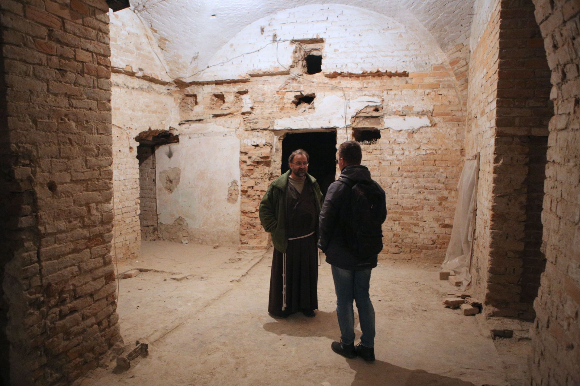 Монастирські підвали та ходи займають два підземних поверхи під католицьким костелом. Разом з настоятелем монастиря спустилися спочатку на мінус перший поверх, де були крипти — підземний цвинтар для капуцинів.