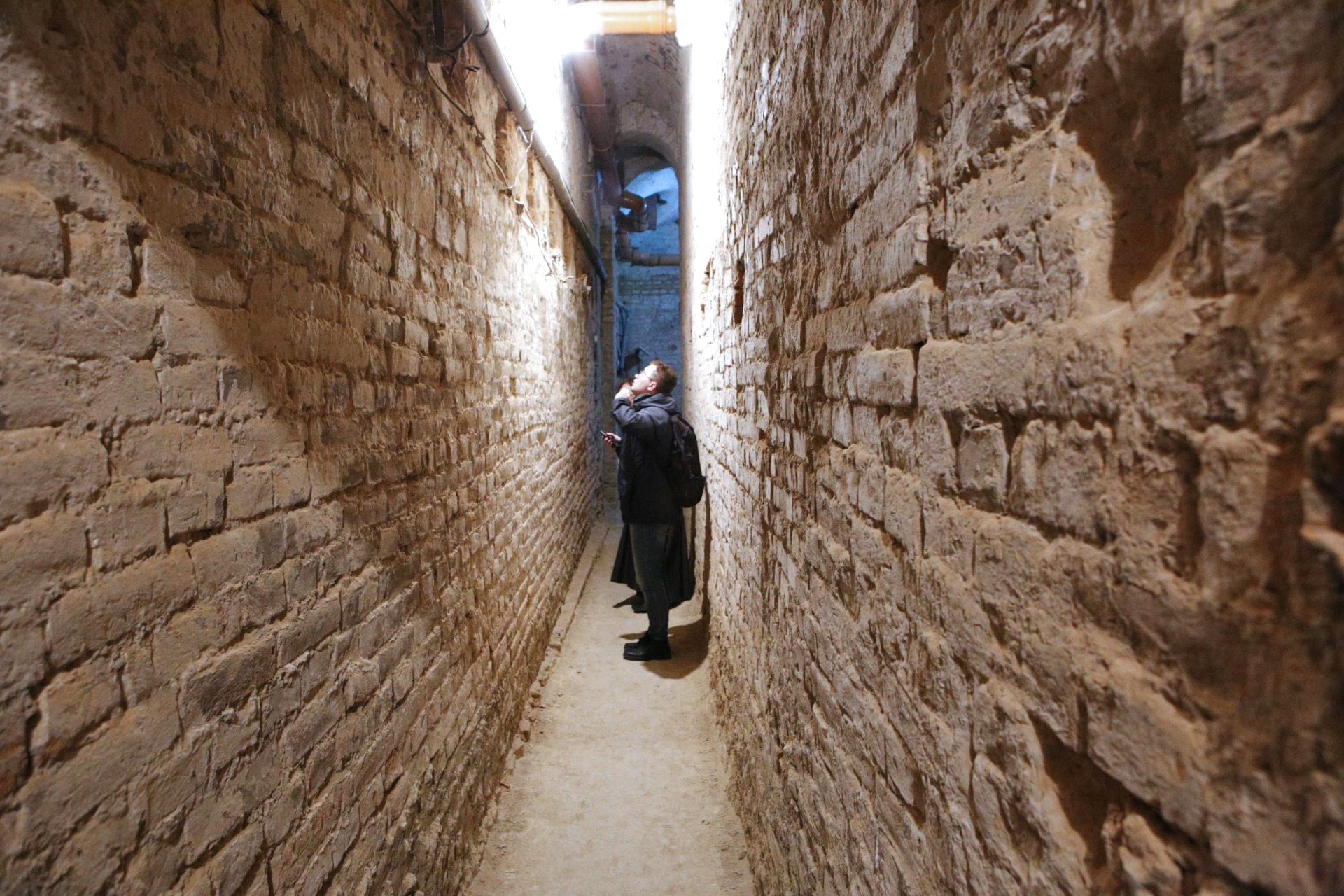 — Підземелля в ті часи будували так: викопували глибоку яму, за допомогою дерев’яної арки-шаблону викладали склепіння з цегли, а потім конструкцію знов закидали землею, — казав Морозов. — Будували такі широкі ходи, щоб умістити не тільки ченців, а й всіх охочих. Крім того, у катакомбах були й припаси, і вода, і навіть вентиляційні канали є, аби люди могли витримати довгу облогу.