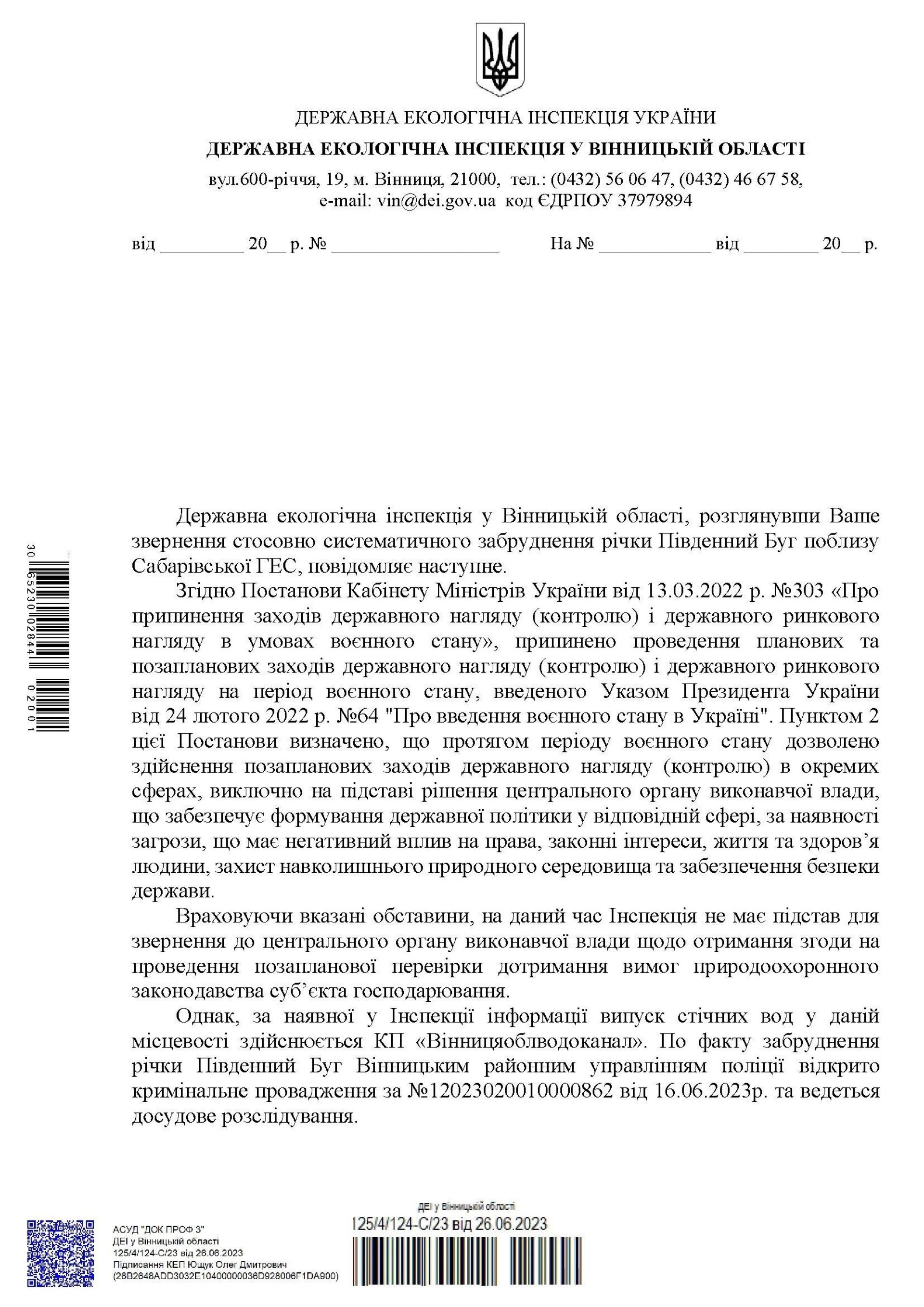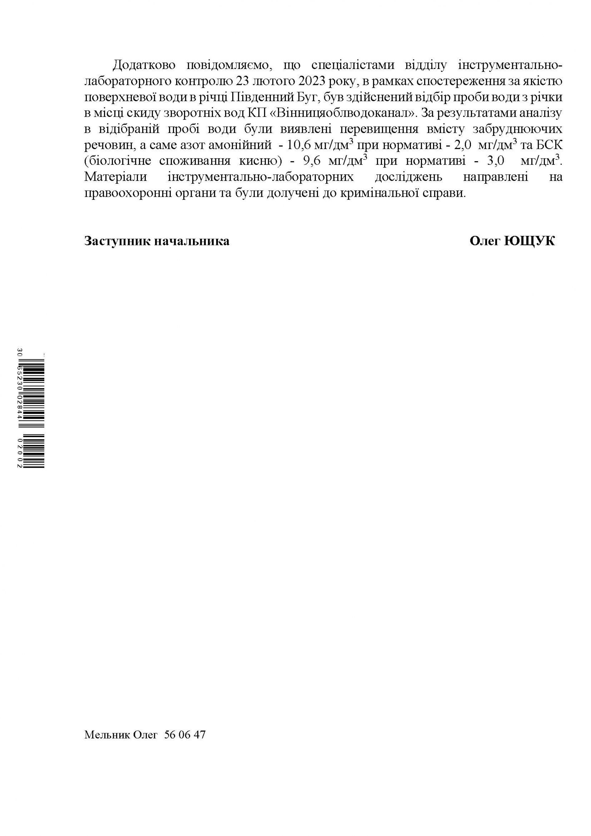 «23 лютого 2023 року, в рамках спостереження за якістю поверхневої води в річці Південний Буг, був здійснений відбір проби води з річки в місці скиду зворотних вод КП «Вінницяоблводоканал», — йдеться у відповіді з підписом заступника начальника екоінспекції Олега Ющука. — За результатами аналізу у відібраній пробі води були виявлені перевищення вмісту забруднюючих речовин, а саме: азот амонійний - 10,6 мг/дм3 при нормативі — 2,0 мг/дм3 та біологічне споживання кисню — 9,6 мг/дм3 при нормативі - 3,0 мг/дм3».