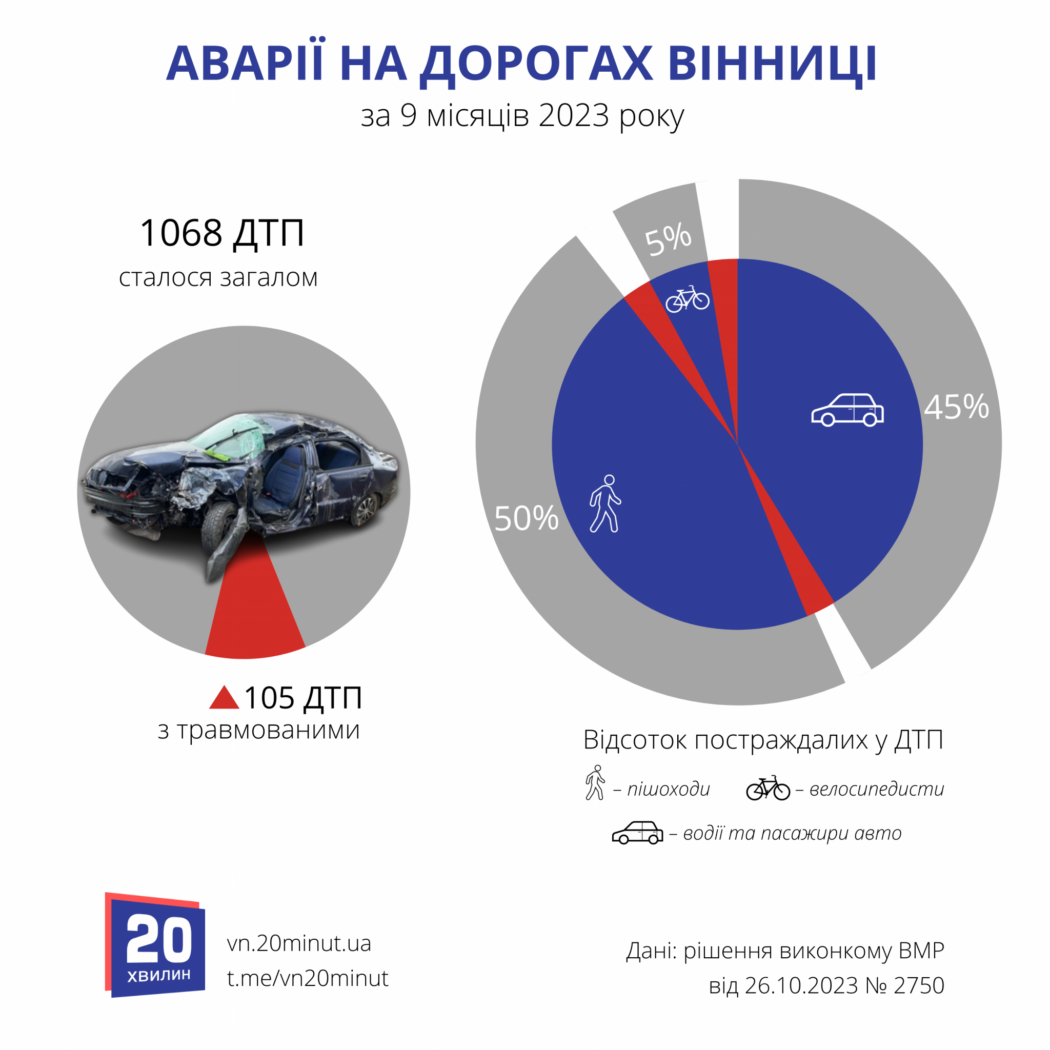 Через ці та інші причини, протягом 9 місяців 2023-го, у Вінниці сталася 1 тисяча 68 аварій, з яких 105 — з постраждалими, з яких у 52 ДТП збили пішоходів, а у шести — збили велосипедистів.