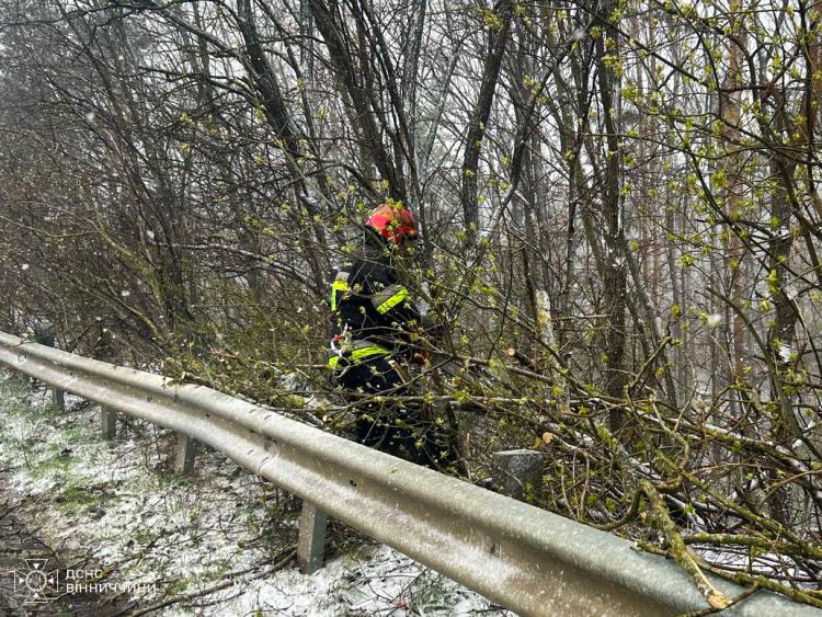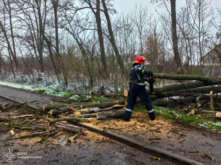 Через мокрий сніг і сильні пориви вітру в кількох населених пунктах області дерева попадали на дороги. Лише сьогодні рятувальники тричі виїжджали на такі виклики — у селі Березина Вінницького району, місті Гнівань та селі Бабчинці Могилів-Подільського району. Через негоду повалені дерева заблокували проїзд транспорту.
