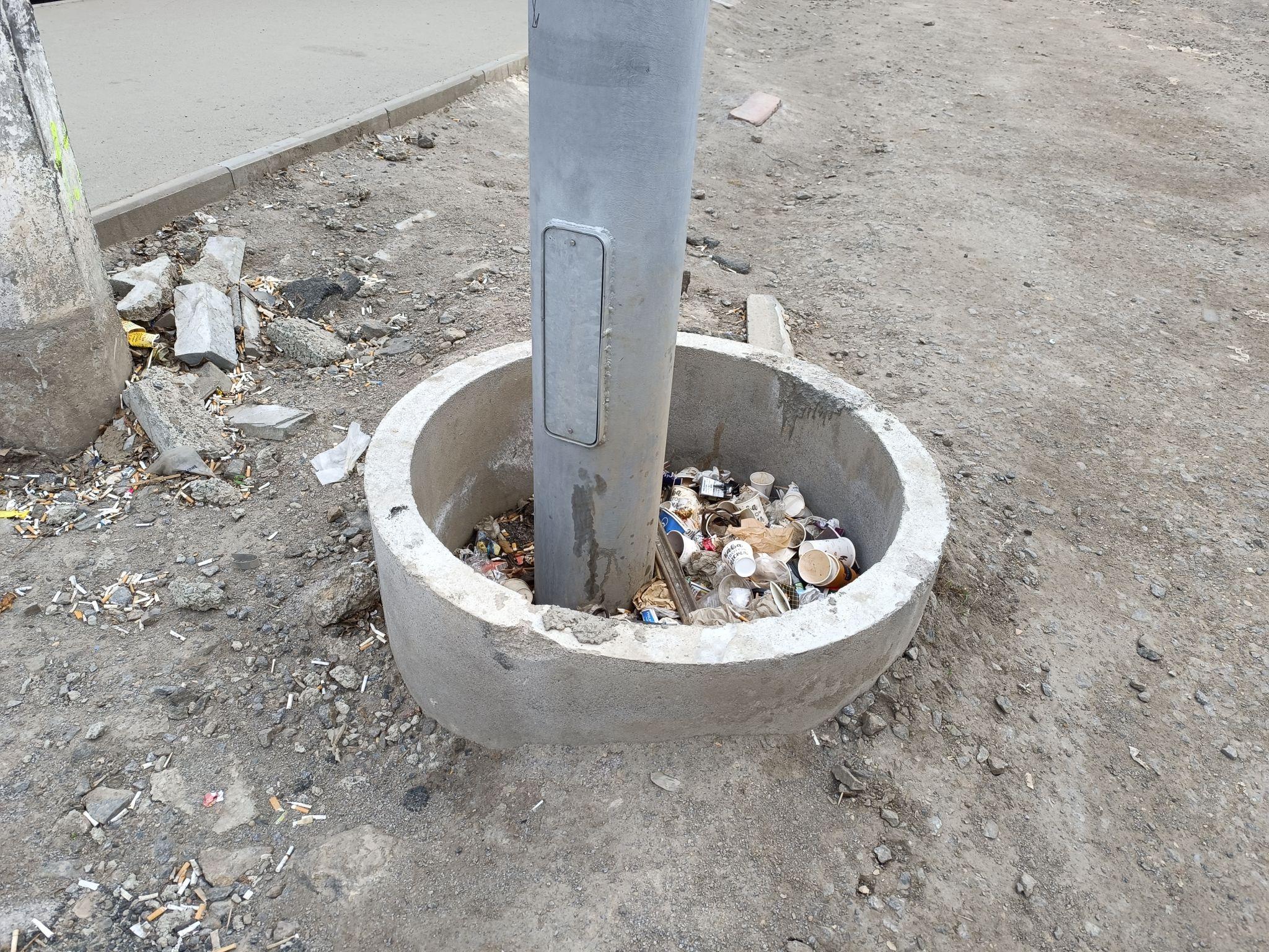 Щодо непродуманості. Ми ще помітили невдале розташування смітника. Він стоїть з правого боку павільйону, його не видно тим пасажирам, що прямують до трамвая від вокзалу — а всі звідти і йдуть до рейкового транспорту. Тому як «смітник» використовують бетонний колодязь під одним з ліхтарів. І він знаходиться ліворуч від зупинки.